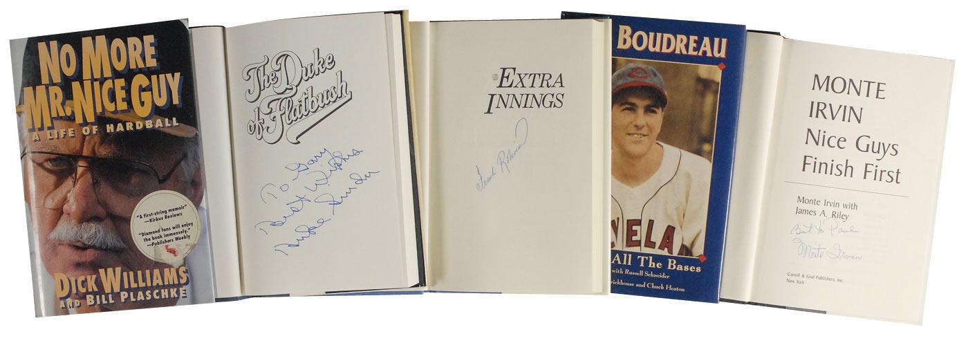 Five hardcover books: The Duke of Flatbush, signed and inscribed on the title page by Duke Snider; Extra Innings, signed on the half-title page by Frank Robinson; No More Mr. Nice Guy, signed and inscribed on the title page by Dick Williams; Covering All the Bases, signed and inscribed on the title page by Lou Boudreau; and Nice Guys Finish First, signed and inscribed on the half-title page by Monte Irvin. In fine overall condition.