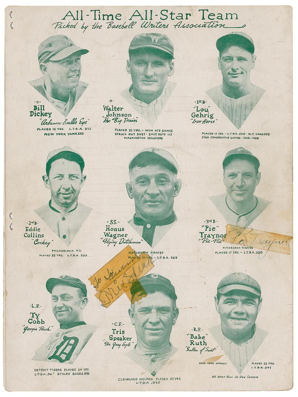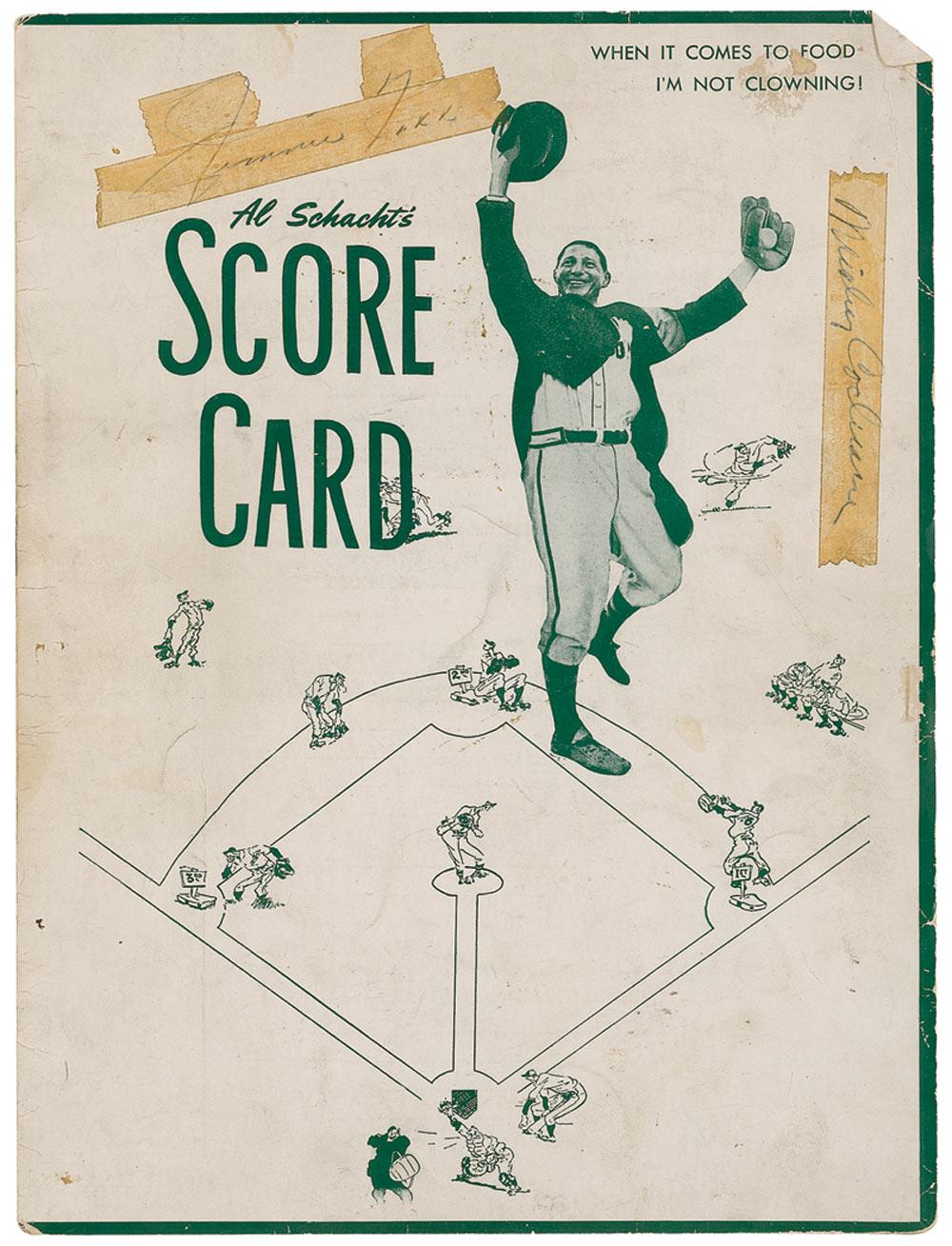 Original menu from Al Schacht’s Score Card restaurant, 8.25 x 11, signed on the front cover in ink by Jimmie Foxx and Mickey Cochrane, and on the back cover by Pie Traynor and Tris Speaker, who inscribed to Howard. Old tape applied over each signature, scattered toning and soiling, creasing and light handling wear, and staples to back cover, otherwise very good condition. Despite the flaws, an interesting piece which could be displayed showing all four signatures.