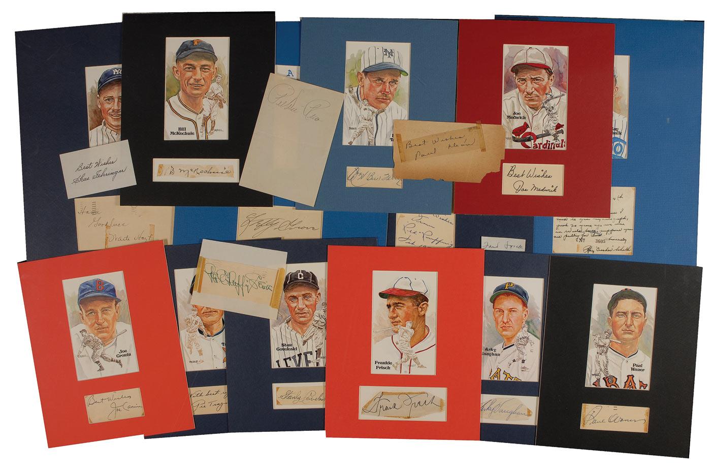 Eighteen ink signatures from Baseball Hall of Famers, five unmatted and 13 matted with Perez/Steele cards. Signers of the unmatted signatures are: Ford Frick, Chas. Gehringer, Pee Wee Reese, Paul Dean, and Duffy Lewis; signers of the matted signatures are: Frank Frisch, Paul Waner, Joe Medwick, Bill Terry, Bill McKechnie, Joe Cronin, Stanly Coveleski, Pie Traynor, Arky Vaughan, Waite Hoyt, Red Ruffing, Ray Schalk (ins), and Lefty Grove. Mild to moderate toning and soiling, adhesive remnants, light brushing to Ray Schalk’s signature, and Frank Frisch’s signature detached from the matted frame, otherwise very good condition.