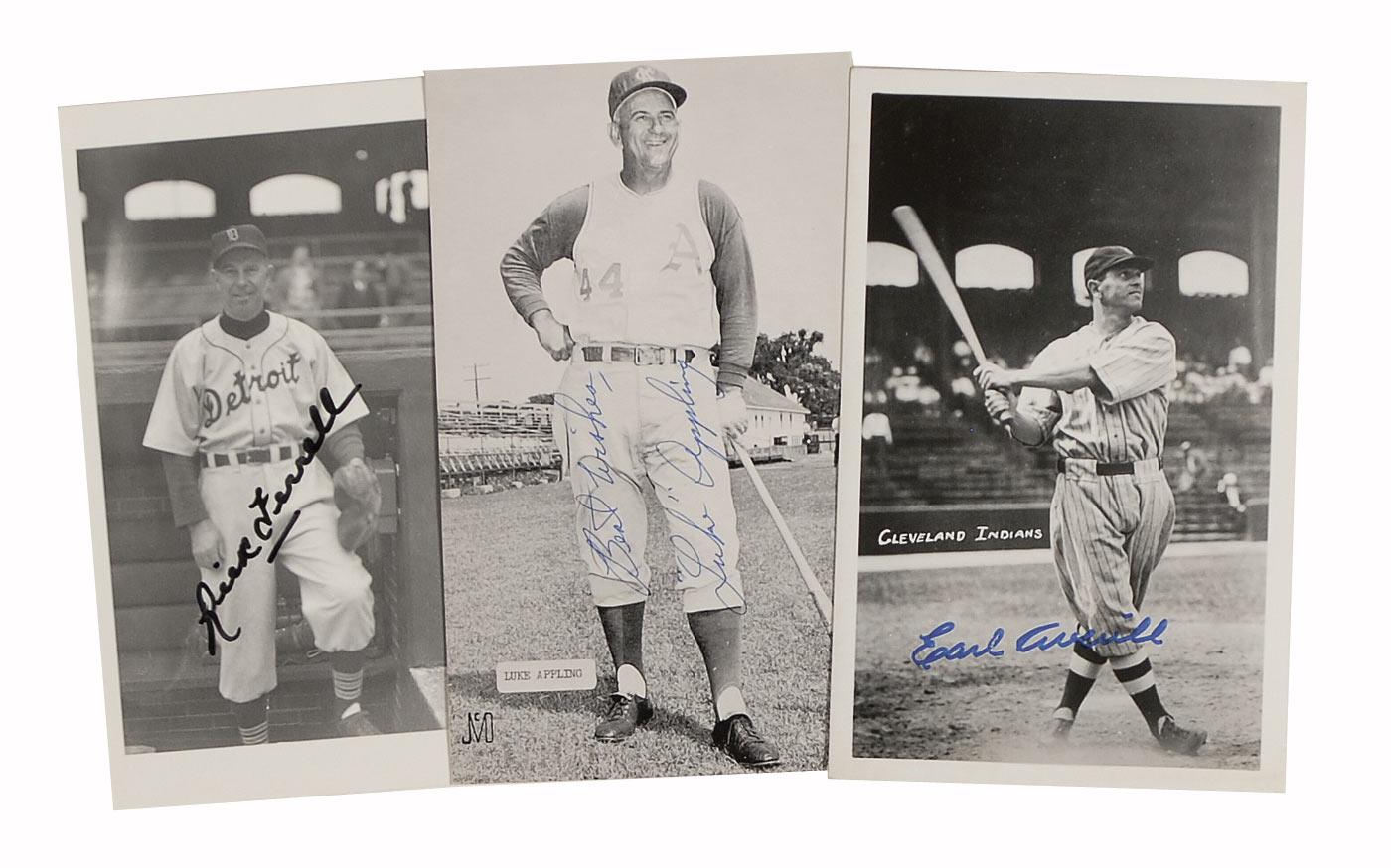 Three postcard photos, all 3.25 x 5.5, each signed in ink or felt tip by the respective Hall of Famer pictured. Signers are: Luke Appling, Rick Ferrell, and Earl Averill. In fine overall condition.