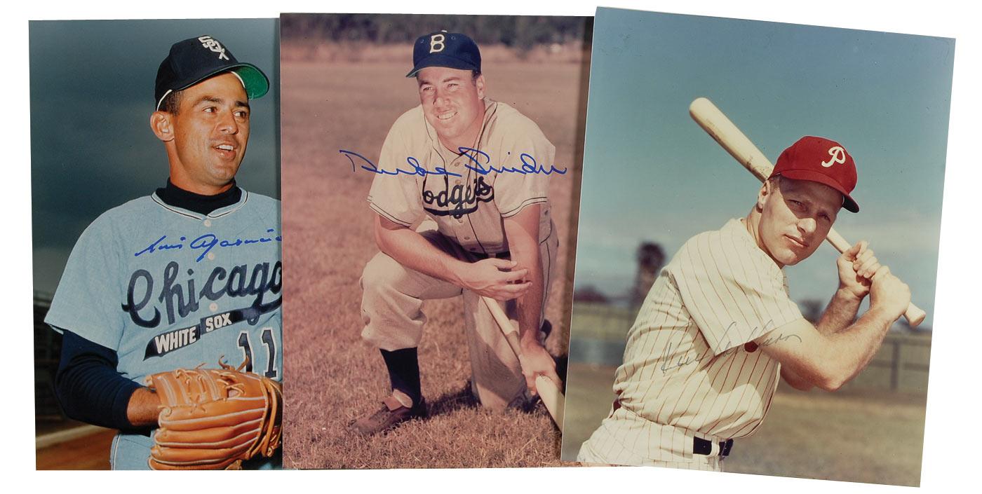 Three color glossy 8 x 10 photos, each signed in felt tip by the respective Hall of Famer pictured. Signers are: Luis Aparicio, Duke Snider, and Richie Ashburn. In fine condition, with Ashburn’s signature light, but legible.