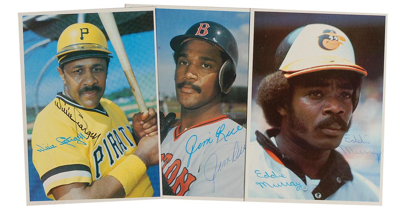 Three color 5 x 7 cardstock photos, issued by Topps in 1980, each signed in ballpoint or felt tip by the respective Hall of Famer pictured. Signers are: Willie Stargell, Eddie Murray, and Jim Rice. In fine condition.