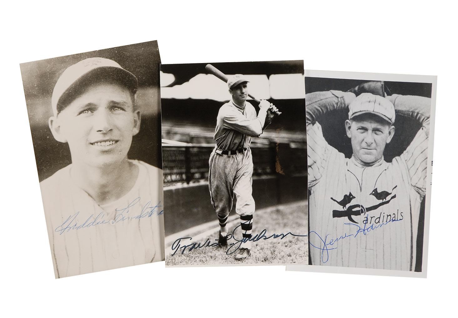Three glossy and postcard photos, all approximately 3.5 x 5, each signed in ballpoint or felt tip by the respective Hall of Famer pictured. Signers are: Freddie Lindstrom, Jesse Haines, and Travis Jackson. Some irregular adhesion to Lindstrom’s signature and impressions and surface wear to Jackson’s photo, otherwise fine condition.