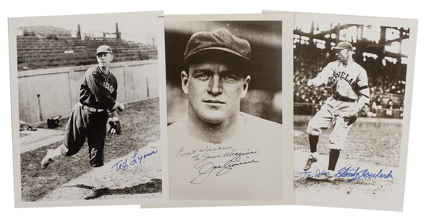 Three glossy 8 x 10 photos, each signed in felt tip by the respective Hall of Famer pictured. Signers are: Stan Coveleski (ins), Ted Lyons, and Joe Cronin (ins). In fine condition, with some scattered light surface marks.
