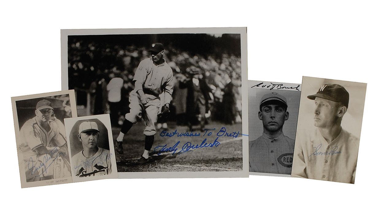 Five signed photos, various finishes, ranging in size from 2.5 x 3.25 up to 10 x 8, each signed in ink or felt tip by the respective Hall of Famer pictured. Signers are: Jesse Haines, Edd Roush, Gabby Hartnett, Sam Rice, and Stan Coveleski (ins). In very good overall condition.