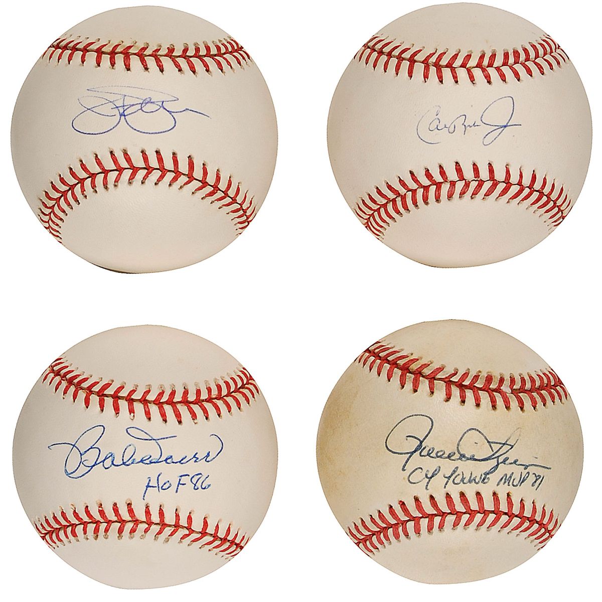 Four official Rawlings baseballs, each signed on the sweet spot in blue ballpoint by a different Hall of Famer. Signers are: Rollie Fingers, Bob Doerr, Cal Ripken, Jr., and Jim Palmer. Toning to Fingers’s ball, otherwise fine condition.