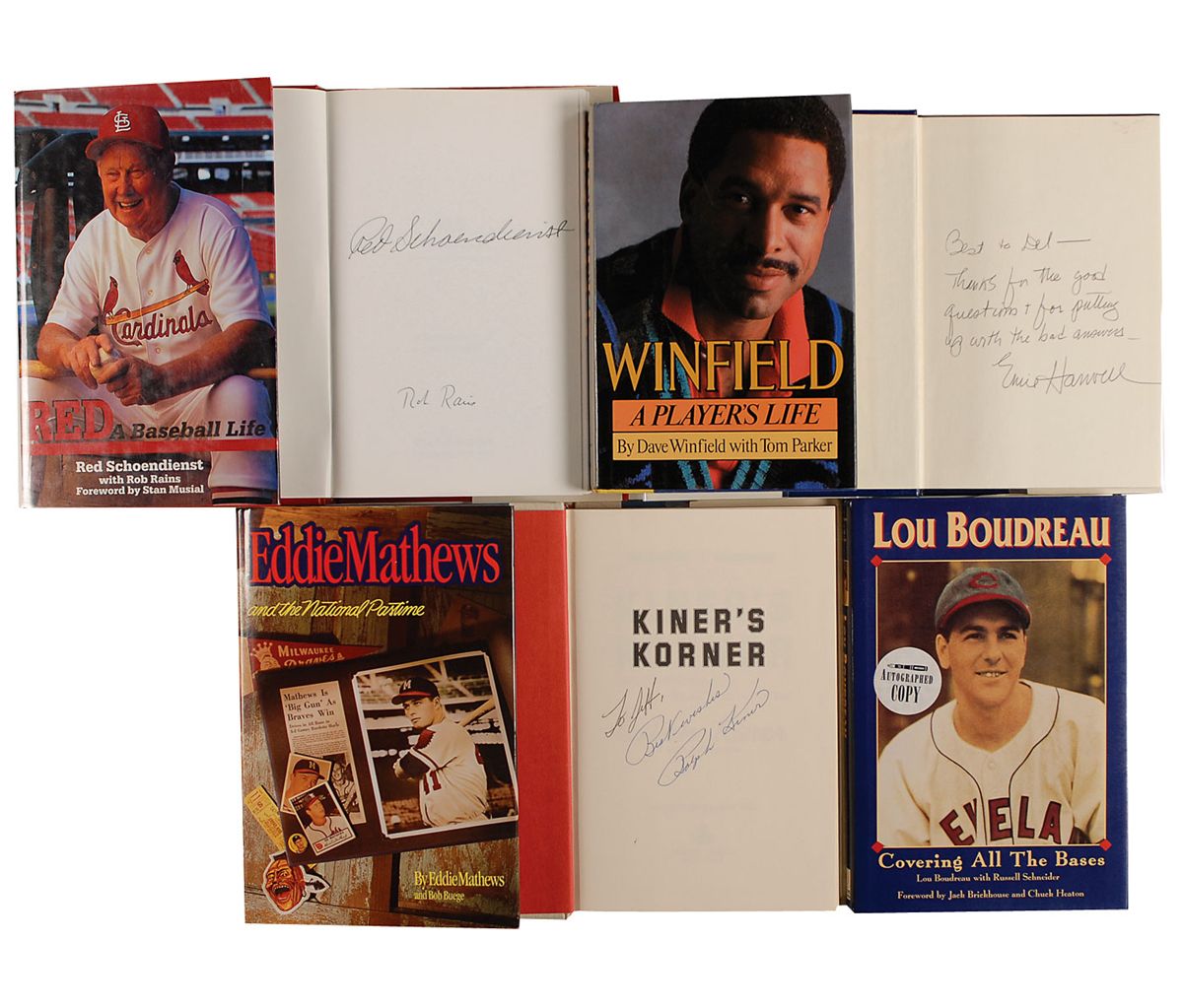 Seven hardcover books, each signed on an opening page by the respective Hall of Fame author, with three adding inscriptions. Signers are: Dave Winfield (A Player’s Life), Lou Boudreau (Covering All the Bases), Red Schoendienst (two copies of Red: A Baseball Life), Eddie Mathews (Eddie Mathews and the National Pastime, ins.), Ralph Kiner (Kiner’s Korner, ins.), and Ernie Harwell (Tuned to Baseball, ins.). In fine overall condition.