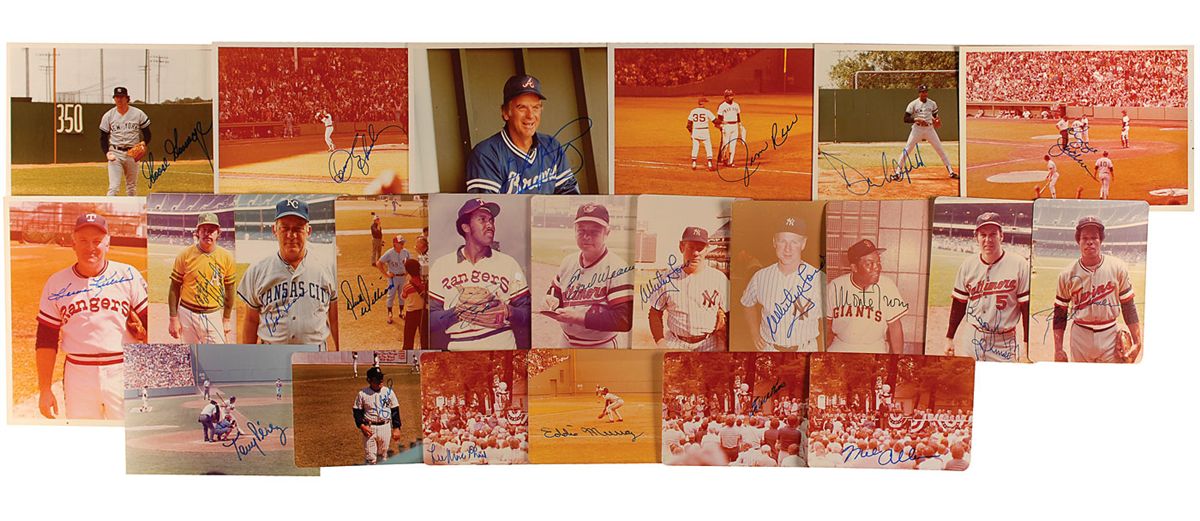 Twenty-two color glossy and satin-finish photos, ranging in size from 3 x 5 up to 5 x 7, each signed in felt tip by the respective Hall of Famer pictured. Signers are: Jim ‘Catfish’ Hunter, Eddie Mathews, Earl Weaver, Harmon Killebrew, Bob Lemon, Dick Williams, Mel Allen, Lee McPhail, Yogi Berra, Whitey Ford, Monte Irvin, Rod Carew, Reggie Jackson, Jim Rice, Dave Winfield, Gaylord Perry, Brooks Robinson, Goose Gossage, Dennis Eckersley, Tony Perez, Eddie Murray, and Fergie Jenkins. In fine condition.