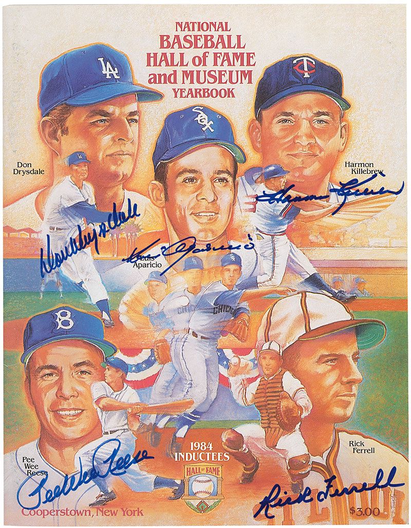 National Baseball Hall of Fame 1984 yearbook, 8.5 x 11, 81 pages, signed on the front cover in blue felt tip by inductees Don Drysdale, Luis Aparicio, Harmon Killebrew, Pee Wee Reese, and Rick Ferrell. In fine condition.