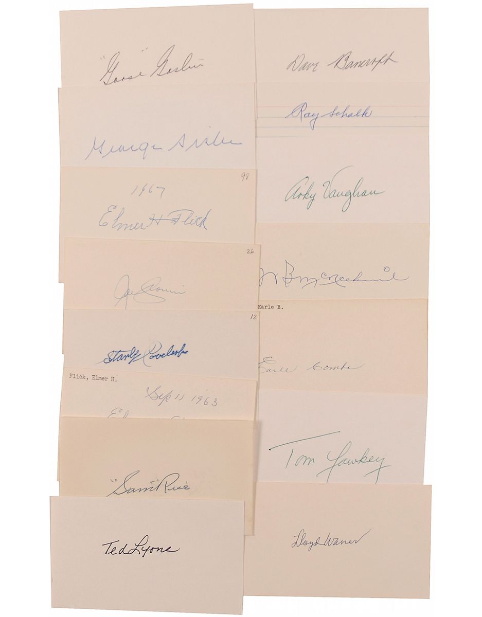 Fifteen ink and ballpoint signatures of Baseball Hall of Famers on 5 x 3 cards. Signers are: Arky Vaughan, Bill McKechnie, Lloyd Waner, Goose Goslin, Tom Yawkey, Dave Bancroft, Earle Combs, Ray Schalk, George Sisler, Joe Cronin, Ted Lyons, Sam Rice, Elmer Flick (2), and Stan Coveleski. In fine condition, with JSA authentication labels affixed to the reverse of Bancroft, Schalk, Sisler, and Combs. Accompanied by JSA certificates of authenticity for those four, and JSA letters of authenticity for Vaughan and McKechnie.