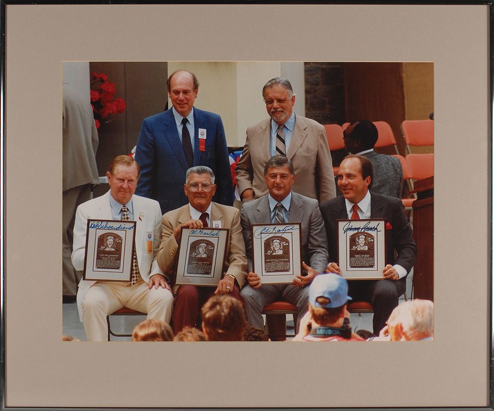 Color glossy 18.5 x 14 photo of the 1989 Hall of Fame Induction Ceremony, signed in blue felt tip by all four inductees: Carl Yastrzemski, Johnny Bench, Red Schoendienst, and Al Barlick. Matted and framed to an overall size of 24.5 x 20.75. In fine condition, with a few light surface creases. Oversized.