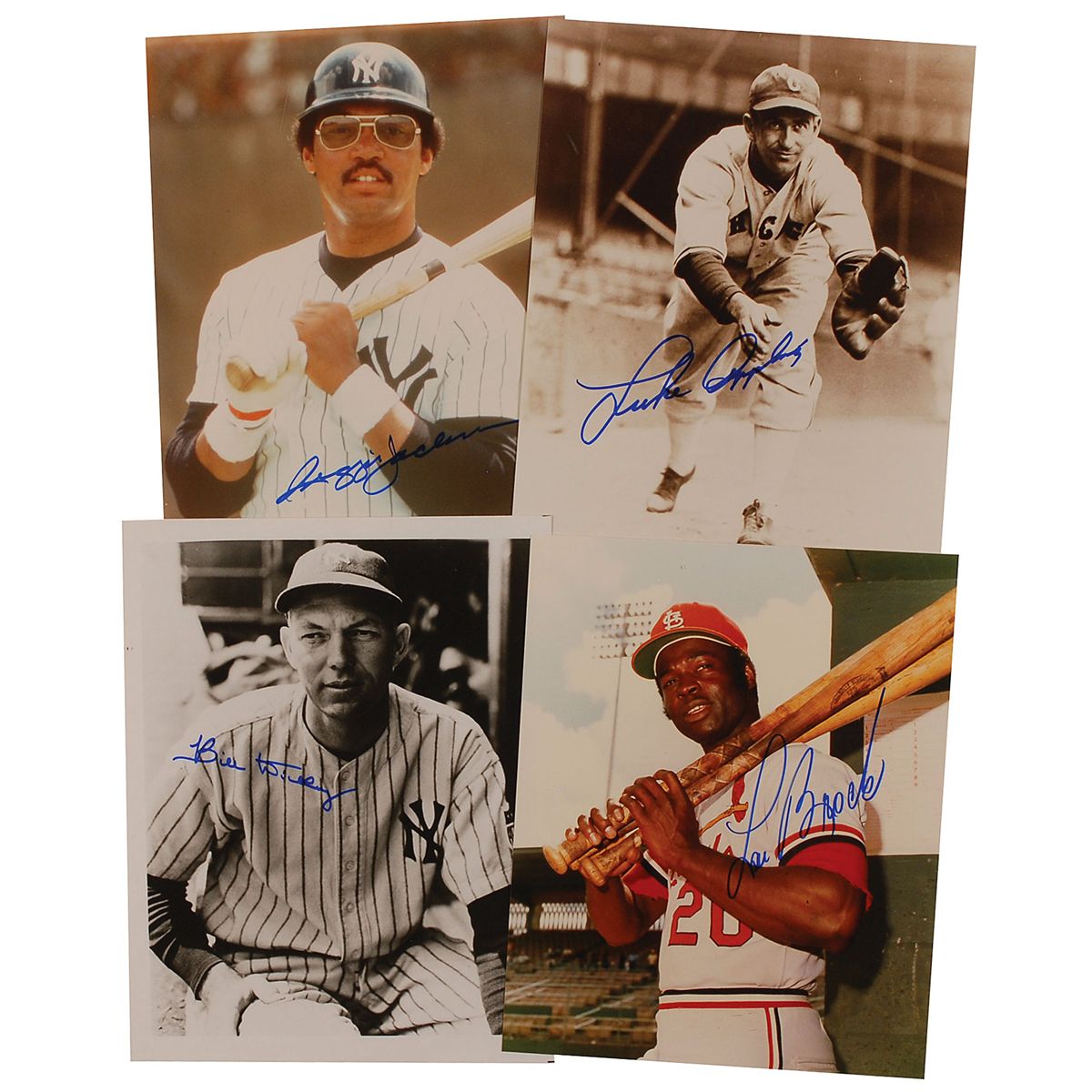 Four glossy 8 x 10 photos, including two color, each signed in blue felt tip by the Hall of Famer pictured. Signers are: Lou Brock, Reggie Jackson, Luke Appling, and Bill Dickey. In fine condition.