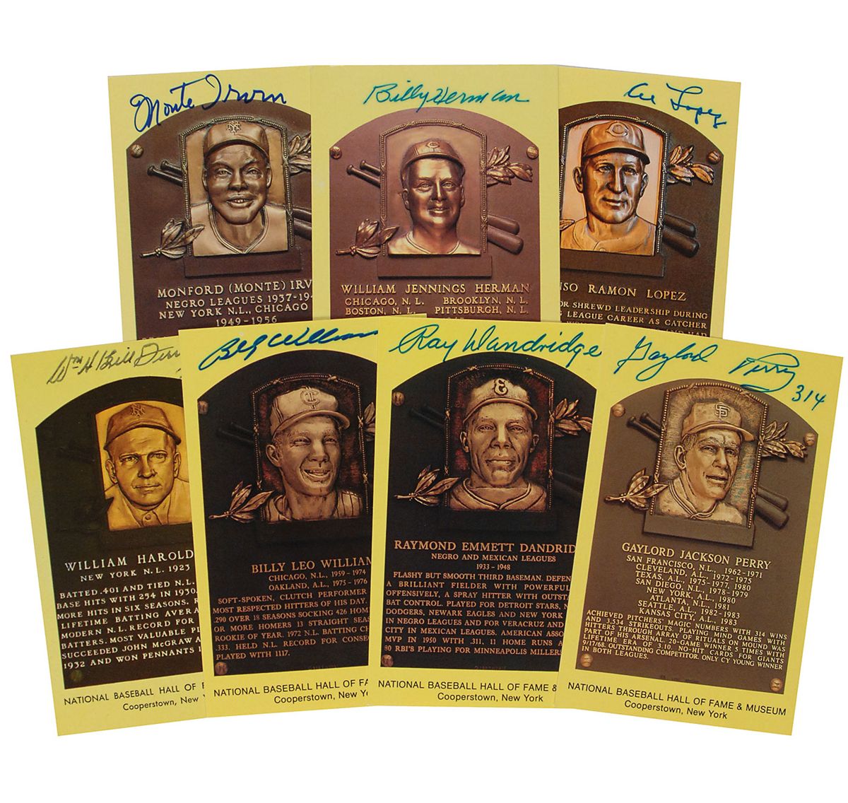 Seven gold Hall of Fame plaque cards, each signed across the top in felt tip or ballpoint by the player pictured. Signers are: Al Lopez, Monte Irvin, Billy Williams, Ray Dandridge, Gaylord Perry, Billy Herman, and Bill Terry. In overall fine condition, with slight haloing to a few signatures.