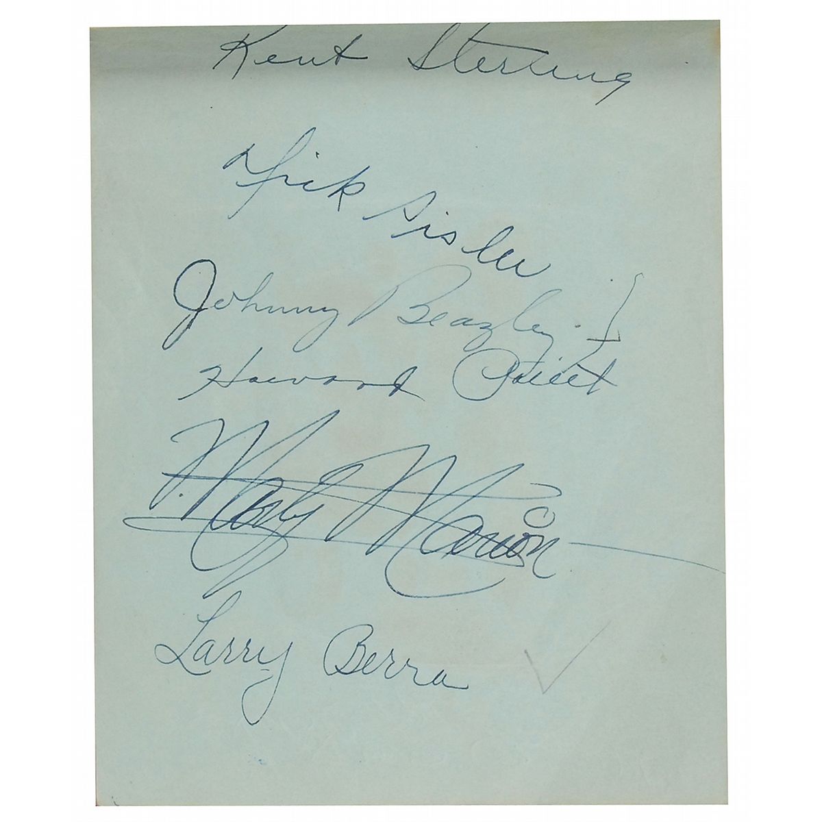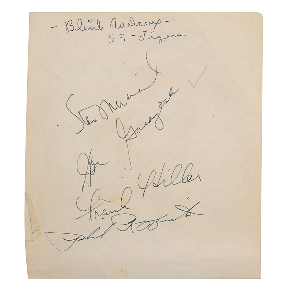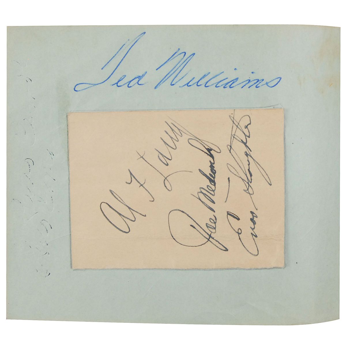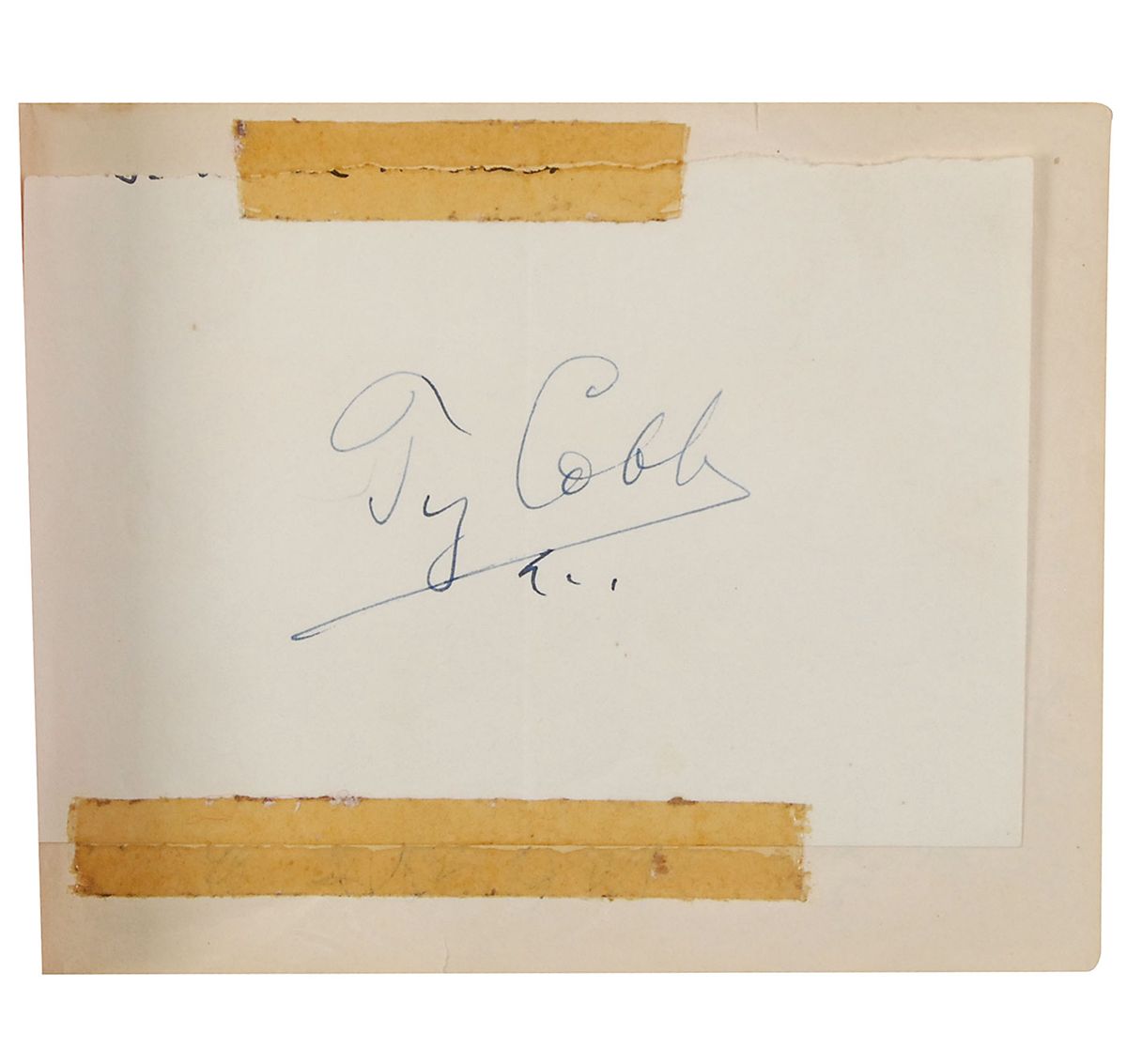 Vintage softcover autograph album, 6 x 4.5, signed inside in ink by over 80 baseball players, including 11 Hall of Famers. Many pages are signed on both sides. Hall of Famer and other especially notable signers are: Ty Cobb (affixed), Joe DiMaggio, Ted Williams, Stan Musial, Phil Rizzuto, Yogi Berra (signed “Larry Berra”), Joe Medwick, Red Schoendienst (signed “Al Schoendienst”), Enos Slaughter, Joe McCarthy, Bobby Doerr (pencil), Gil Hodges, Bucky Harris, and Dick Sisler. Other signers consist primarily of members of the late-1940s St. Louis Cardinals, Brooklyn Dodgers, New York Yankees, and Boston Red Sox teams. Central vertical fold through the affixed Cobb signature, and front cover of book nearly detached, otherwise fine condition. A more comprehensive list is available online at rrauction.com.