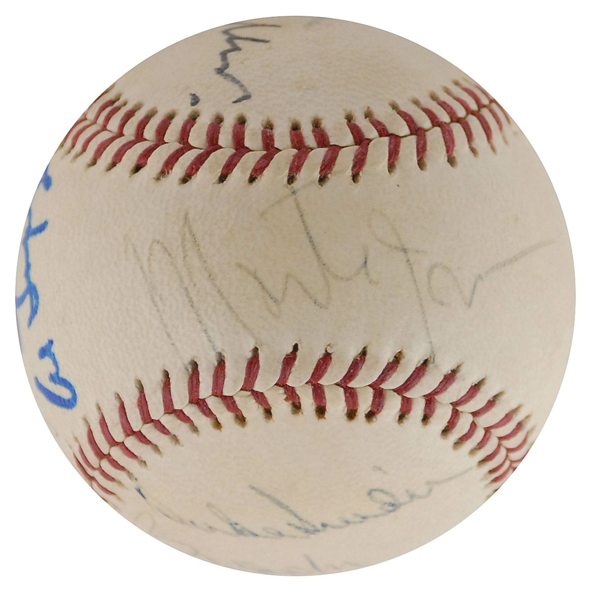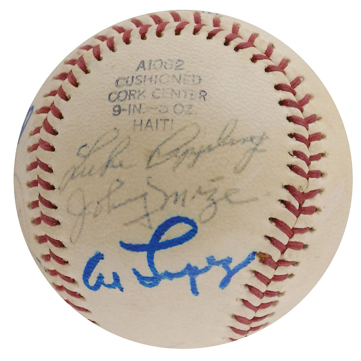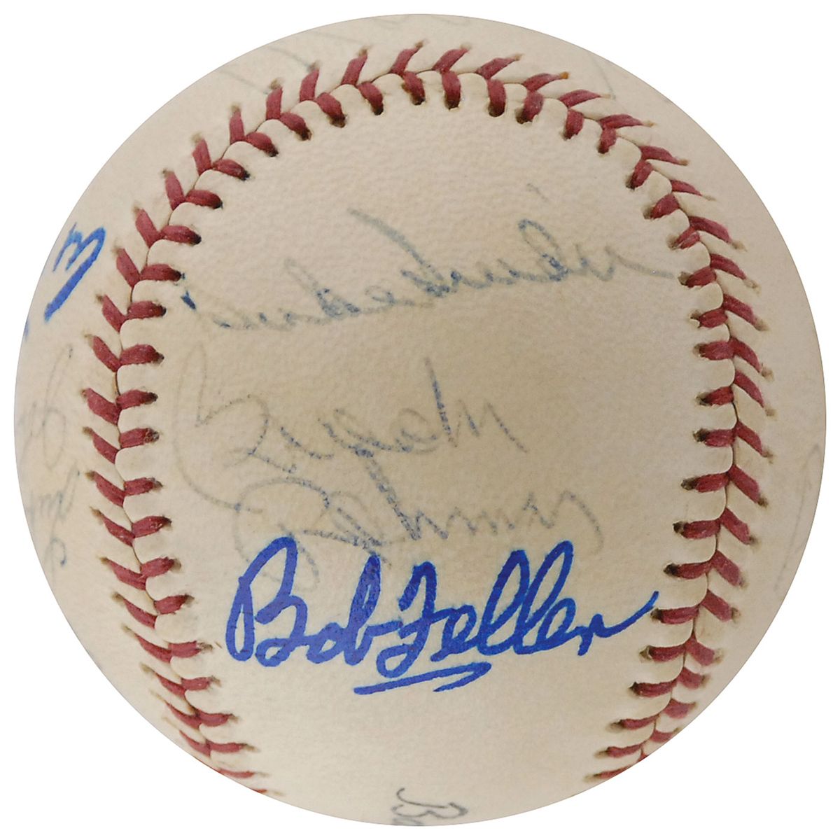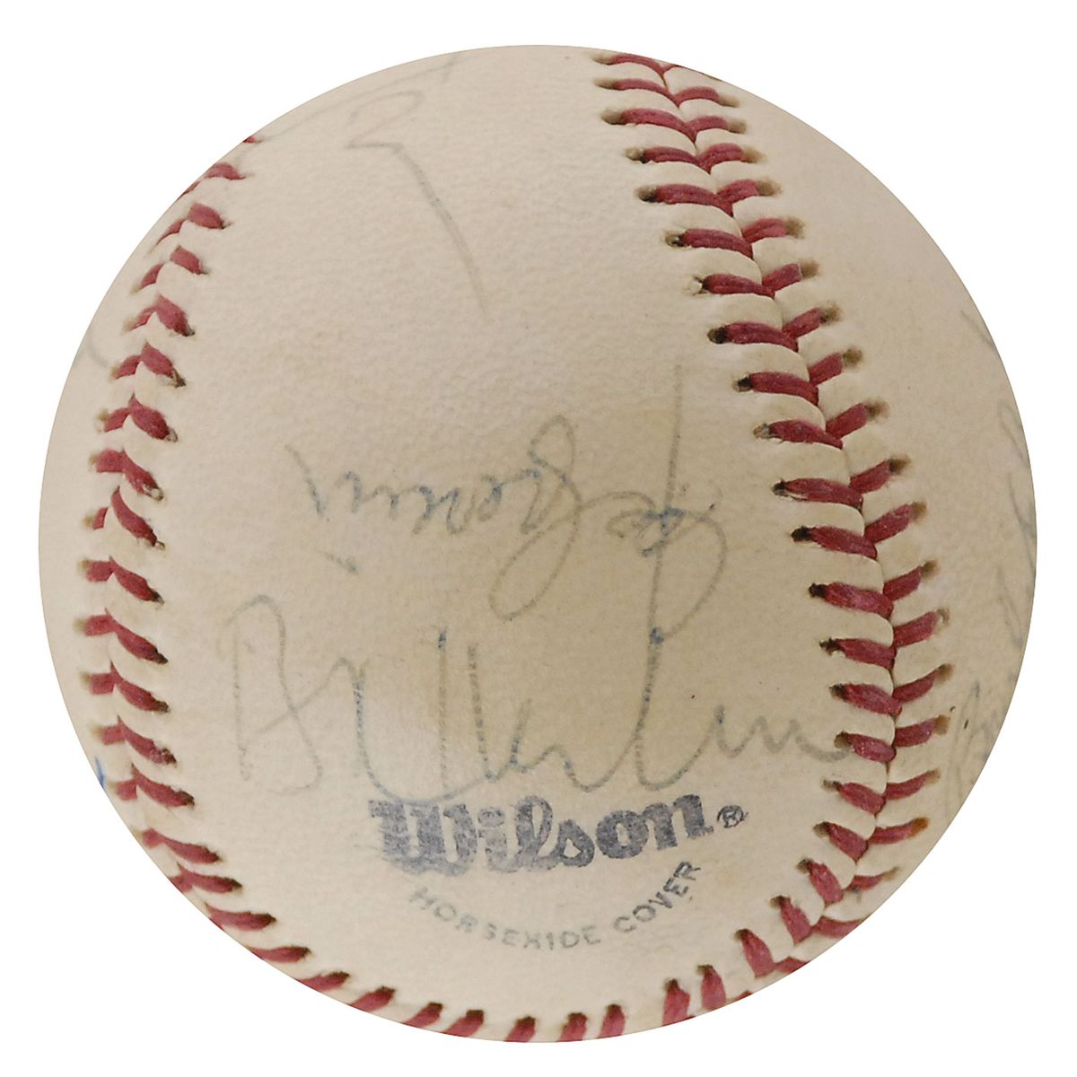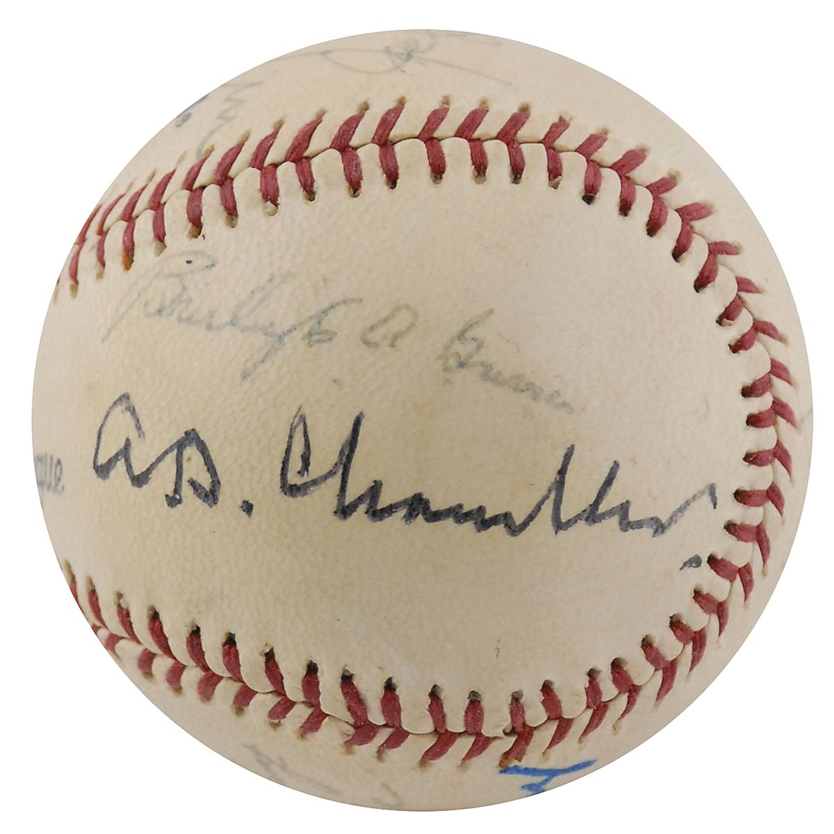 Official Wilson Babe Ruth League baseball signed in felt tip and ballpoint on the sweet spot and side panels by 11 Hall of Famers, including: Duke Snider, Brooks Robinson, Bob Feller, Burleigh Grimes, A. B. ‘Happy’ Chandler, Luke Appling, Johnny Mize, Al Lopez, Joe Cronin, Bowie Kuhn, and Monte Irvin (ss). Ballpoint signatures slightly faded, otherwise fine condition.