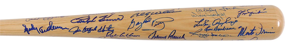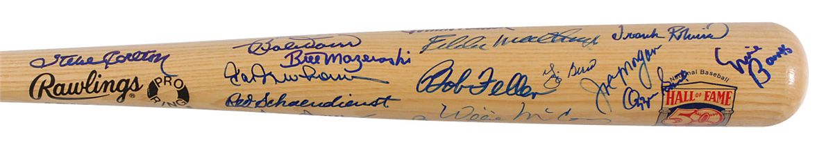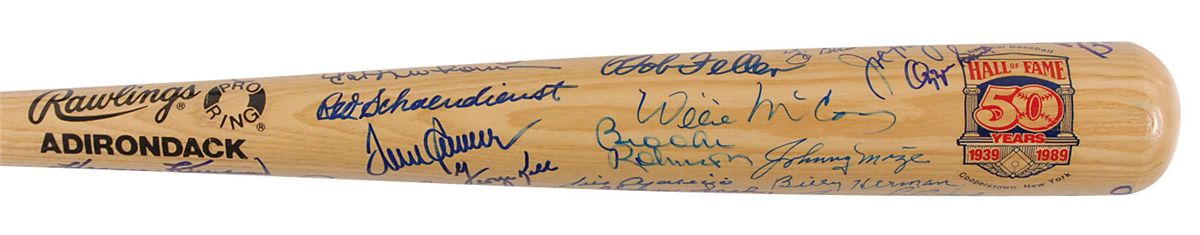 Official Rawlings Adirondack baseball bat honoring the 50th anniversary of the Baseball Hall of Fame, signed in blue felt tip on the barrel by 40 members, including: Sparky Anderson, Luis Aparicio, Luke Appling, Richie Ashburn, Ernie Banks, Johnny Bench, Yogi Berra, Lou Boureau, Steve Carlton, Orlando Cepeda, Bob Doerr, Bob Feller, Rollie Fingers, Whitey Ford, Charles Gehringer, Billy Herman, Jim ‘Catfish’ Hunter, Monte Irvin, Reggie Jackson, Fergie Jenkins, George Kell, Harmon Killebrew, Ralph Kiner, Eddie Mathews, Bill Mazeroski, Willie McCovey, Johnny Mize, Joe Morgan, Hal Newhouser, Gaylord Perry, Phil Rizzuto, Brooks Robinson, Frank Robinson, Red Schoendienst, Tom Seaver, Enos Slaughter, Ozzie Smith, Warren Spahn, Willie Stargell, and Billy Williams. In fine condition.