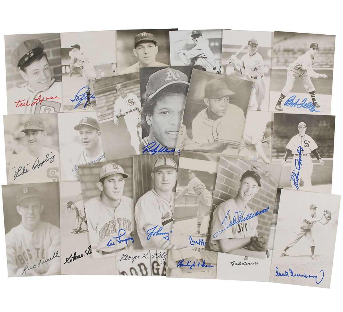 Desirable collection of 25 postcard photos, 3.5 x 5.5, each signed in felt tip or ballpoint by the Hall of Famer pictured, including: Ted Williams, Hank Greenberg, Earl Averill, Burleigh Grimes, Ted Lyons (2), Lefty Gomez, George L. Kelly, Charles Gehringer, Rick Ferrell, Carl Hubbell, Bill Dickey, Johnny Mize, Al Lopez, Joe Sewell, Jocko Conlan, Bob Feller, Luke Appling (2), Billy Herman (2), Willie Mays, Monte Irvin, Rickey Henderson, and Hank Aaron. In overall fine condition.