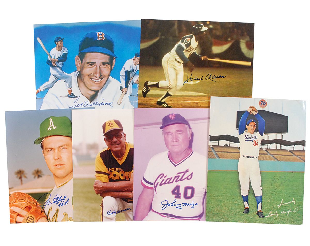 Six color glossy and cardstock photos, 8 x 10 and 10 x 8, each signed in felt tip or ballpoint by the Hall of Famer pictured, including: Sandy Koufax, Ted Williams, Hank Aaron, Johnny Mize, Billy Herman, and Jim ‘Catfish’ Hunter. In overall fine condition, with a light stain to one corner of the Koufax photo.