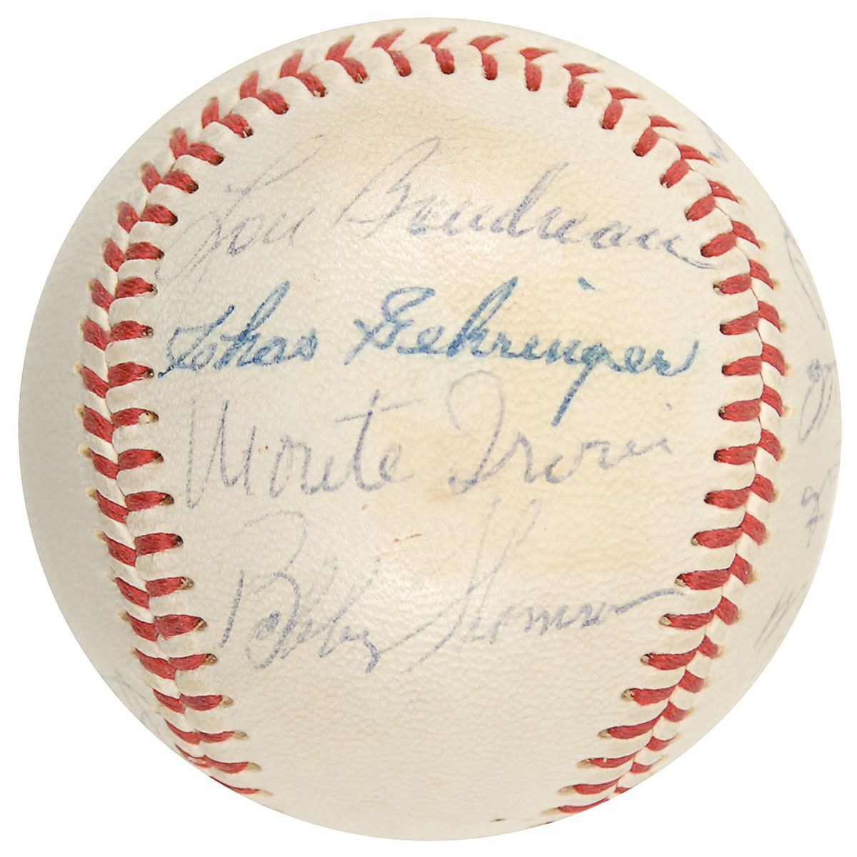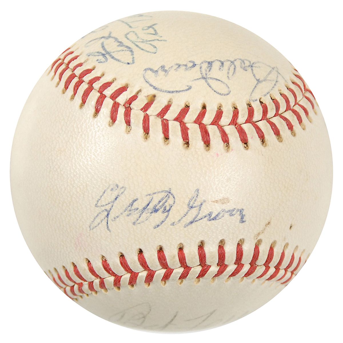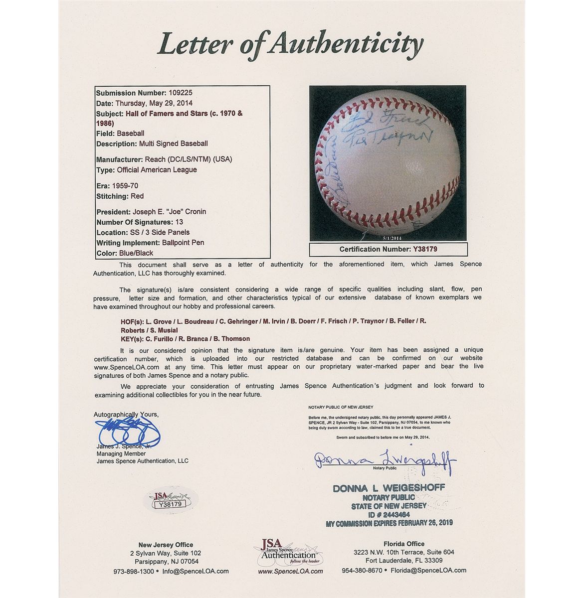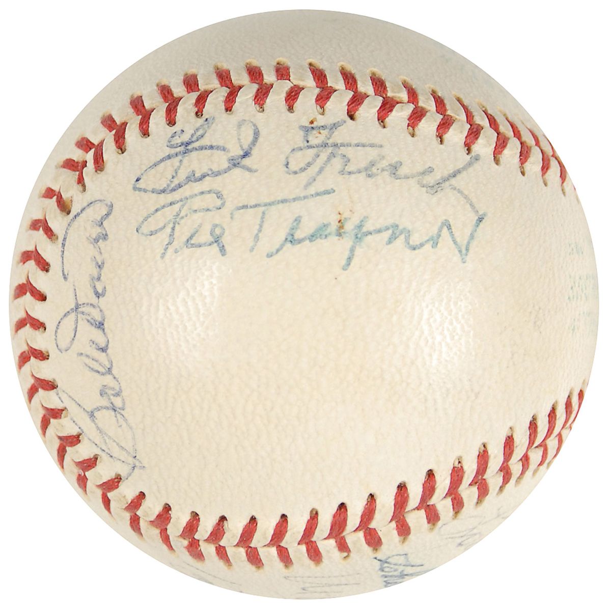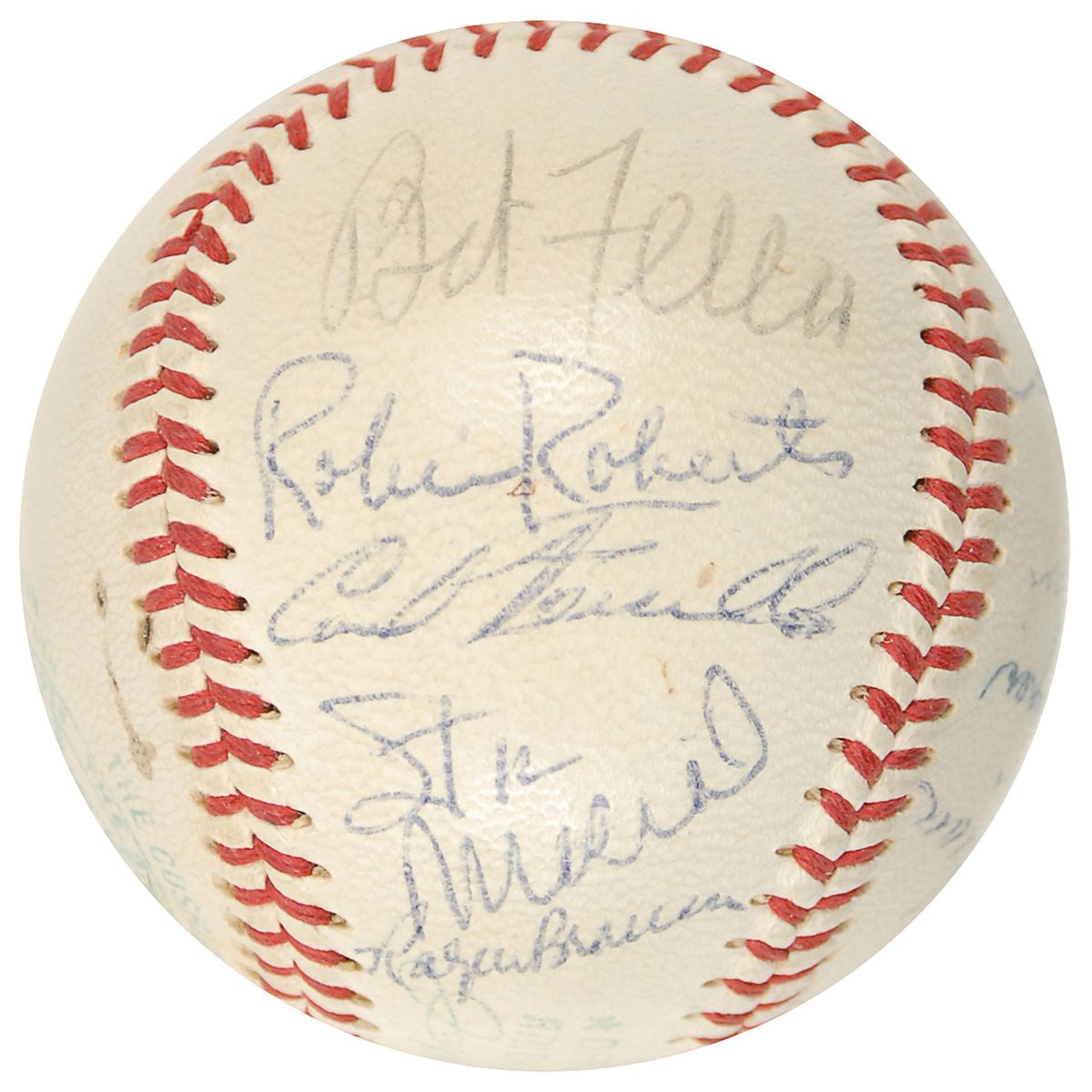 Official Spalding American League baseball signed in blue and black ballpoint on the sweet spot and side panels by 13 Major League greats, primarily Hall of Famers, including: Lefty Grove (ss), Pie Traynor, Frank Frisch, Stan Musial, Bob Doerr, Robin Roberts, Lou Boudreau, Charles Gehringer, Bob Feller, Monte Irvin, Carl Furrillo, Ralpha Branca, and Bobby Thomson. Light scattered toning and soiling, otherwise fine condition. Accompanied by a full letter of authenticity from JSA.