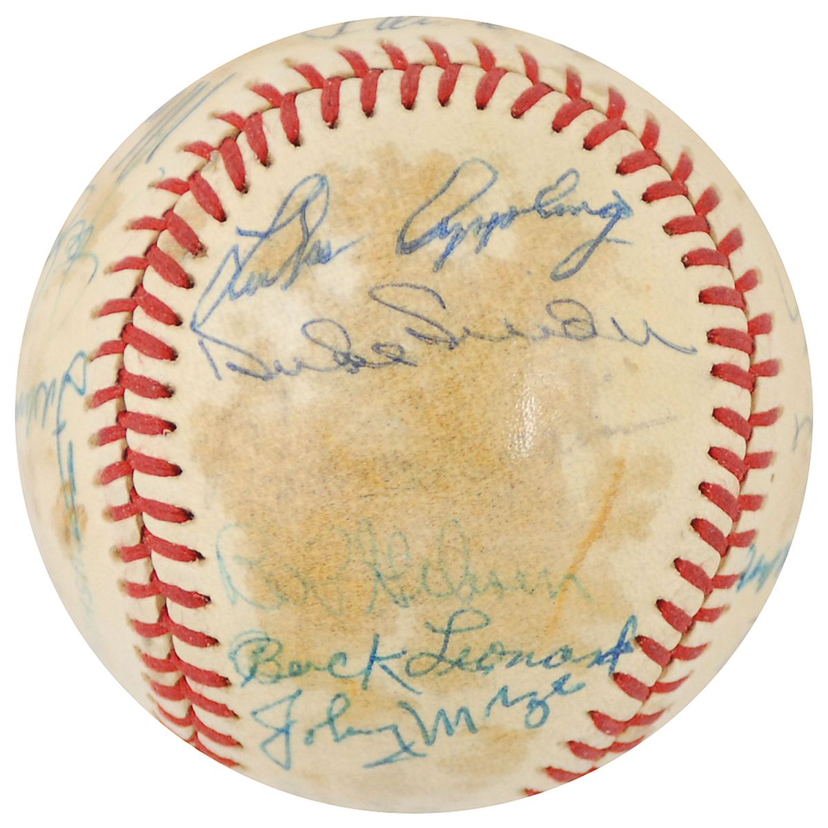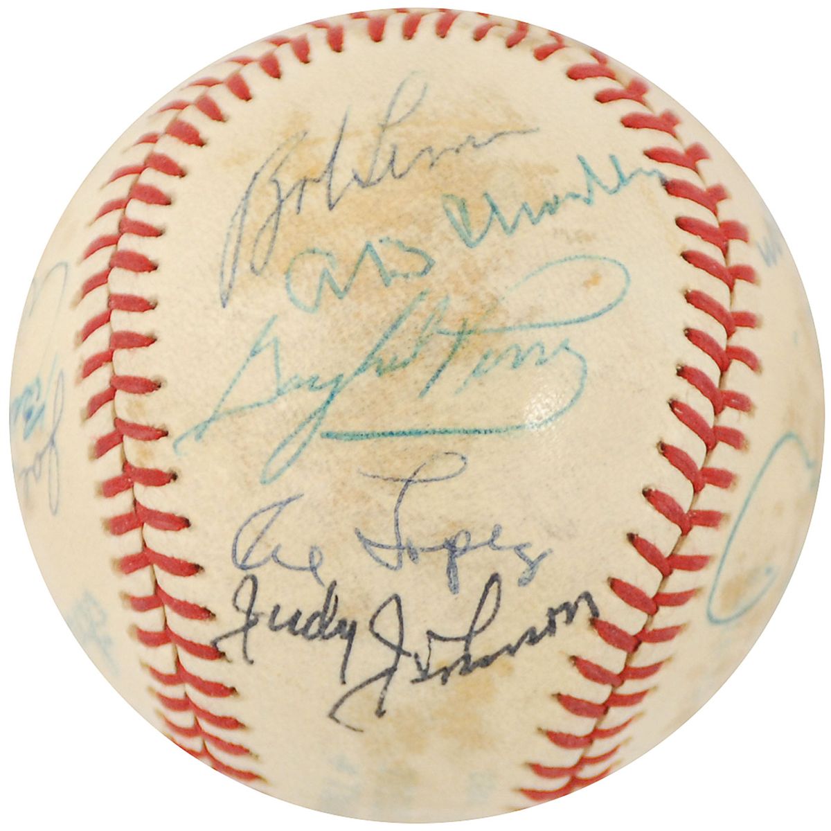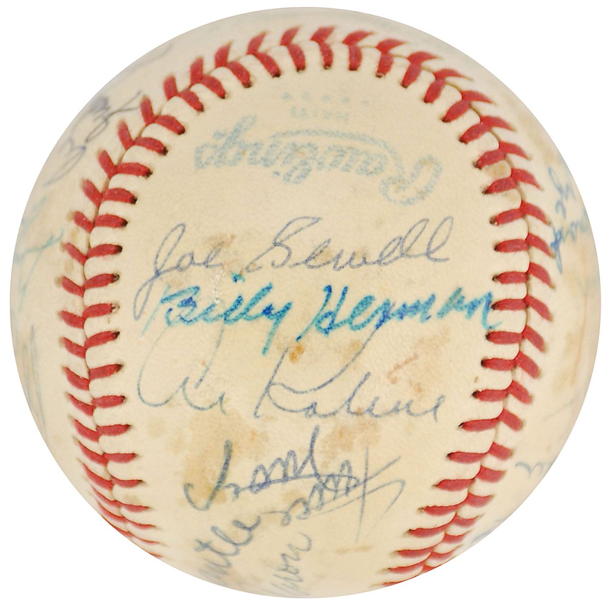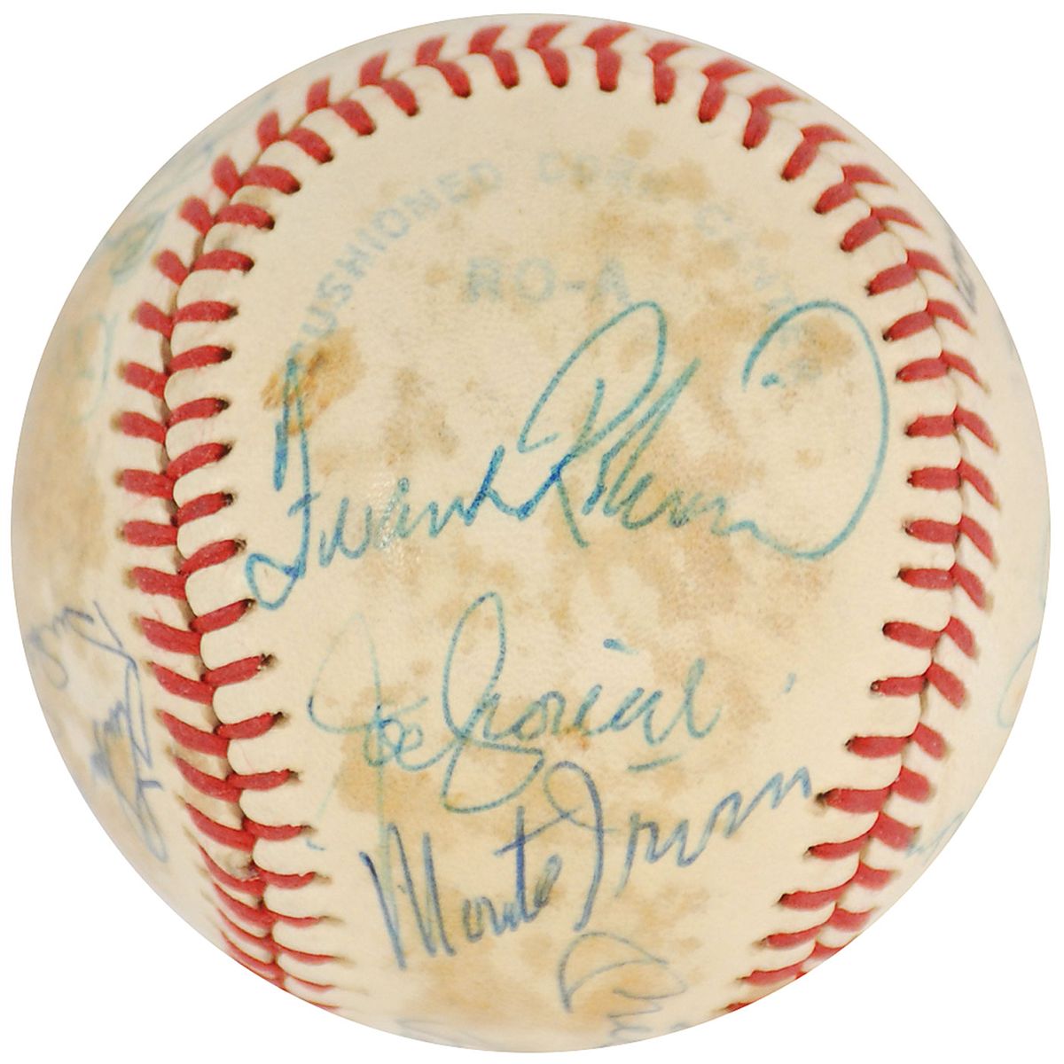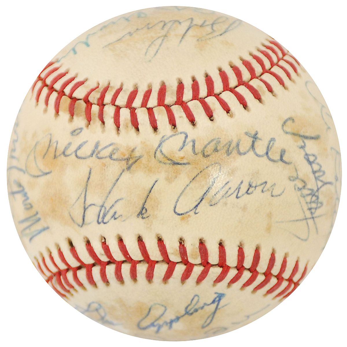 Official Rawlings American League baseball signed in ink on the sweet spot and side panels by 19 Hall of Famers, including: Mickey Mantle (ss), Hank Aaron (ss), Willie Mays, Joe Cronin, Frank Robinson, Joe Sewell, Billy Herman, Al Kaline, Monte Irvin, Luke Appling, Duke Snider, Bob Gibson, Buck Leonard, Johnny Mize, Bob Lemon, A. B. ‘Happy’ Chandler, Gaylord Perry, Al Lopez, and Judy Johnson. Heavy irregular toning affecting the overall appearance and a light coat of shellac, otherwise very good condition.