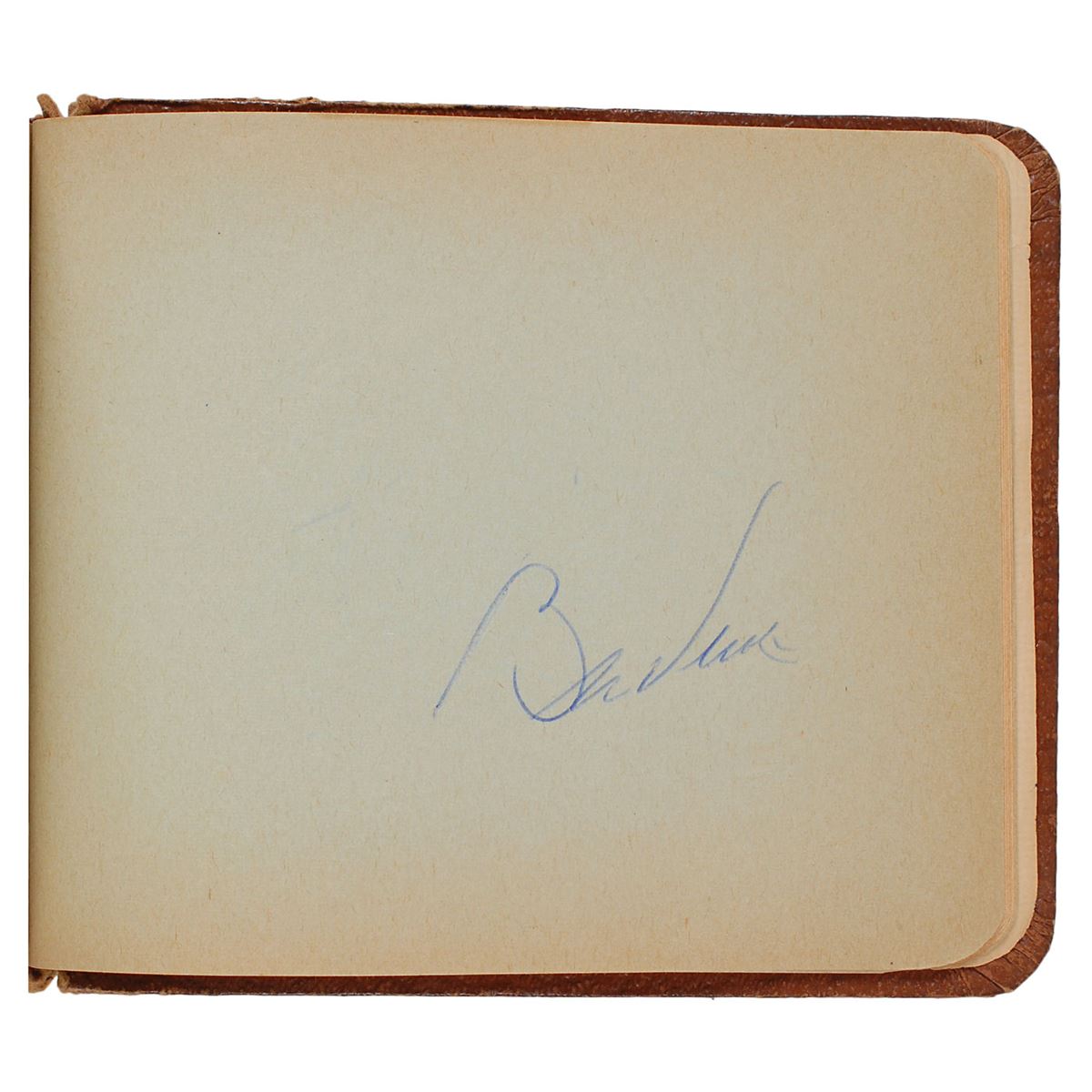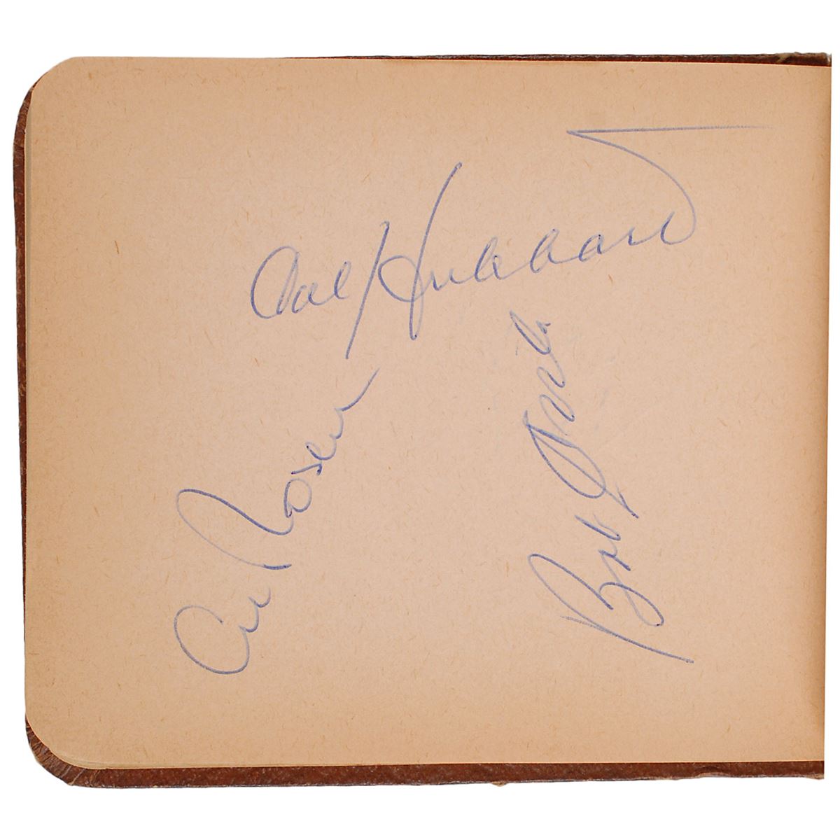 Hardcover autograph album, 6 x 4.75, signed inside in ballpoint and pencil by over sixty people, including several baseball Hall of Famers, many players, and a few entertainment figures, including: Bill Veeck, Nellie Fox, Cal Hubbard, Bob Feller, Larry Doby, Whitey Ford, Phil Rizzuto, Mel Allen, Billy Pierce, Al Rosen, Irv Noren, Andy Carey, Virgil Trucks, Chico Carrasquel, Walt Dropo, Jascha Heifetz, and forty others. In fine condition, with toning throughout.