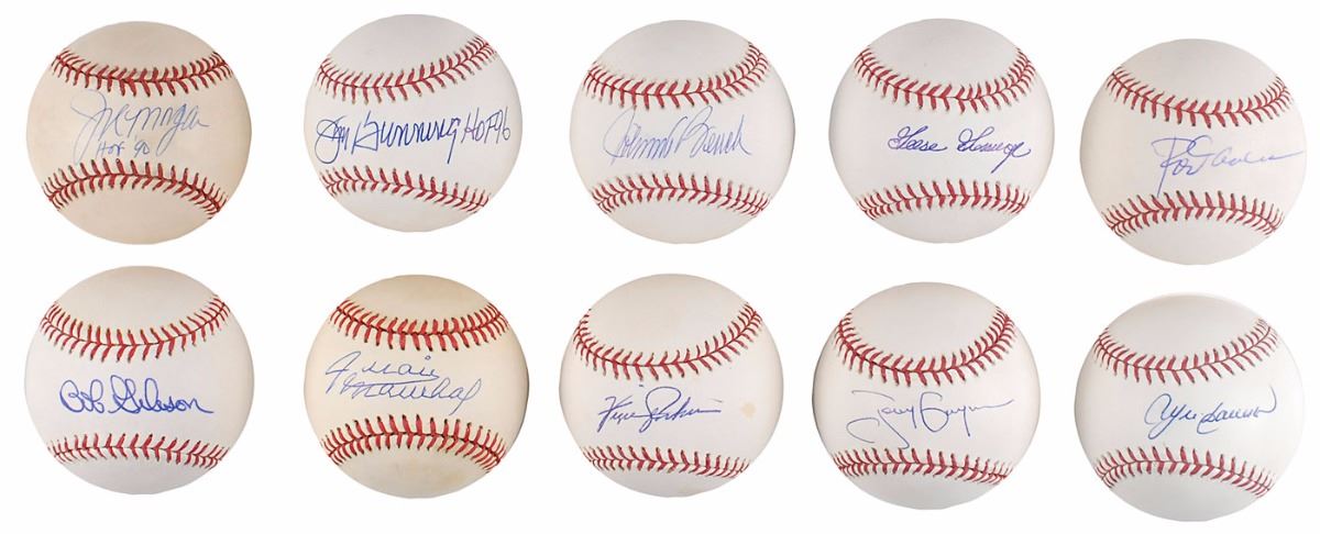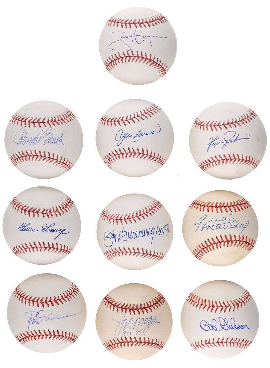 Collection of ten official Rawlings baseballs (including NL and MLB), each signed on the sweet spot in blue ballpoint by a different Hall of Famer, including: Johnny Bench, Bob Gibson, Tony Gwynn, Juan Marichal, Rod Carew, Andre Dawson, Joe Morgan, Goose Gossage, Fergie Jenkins, and Jim Bunning. Scattered spots of toning to some baseballs, otherwise overall fine condition.