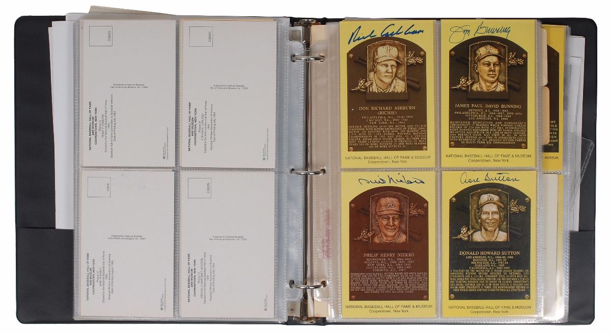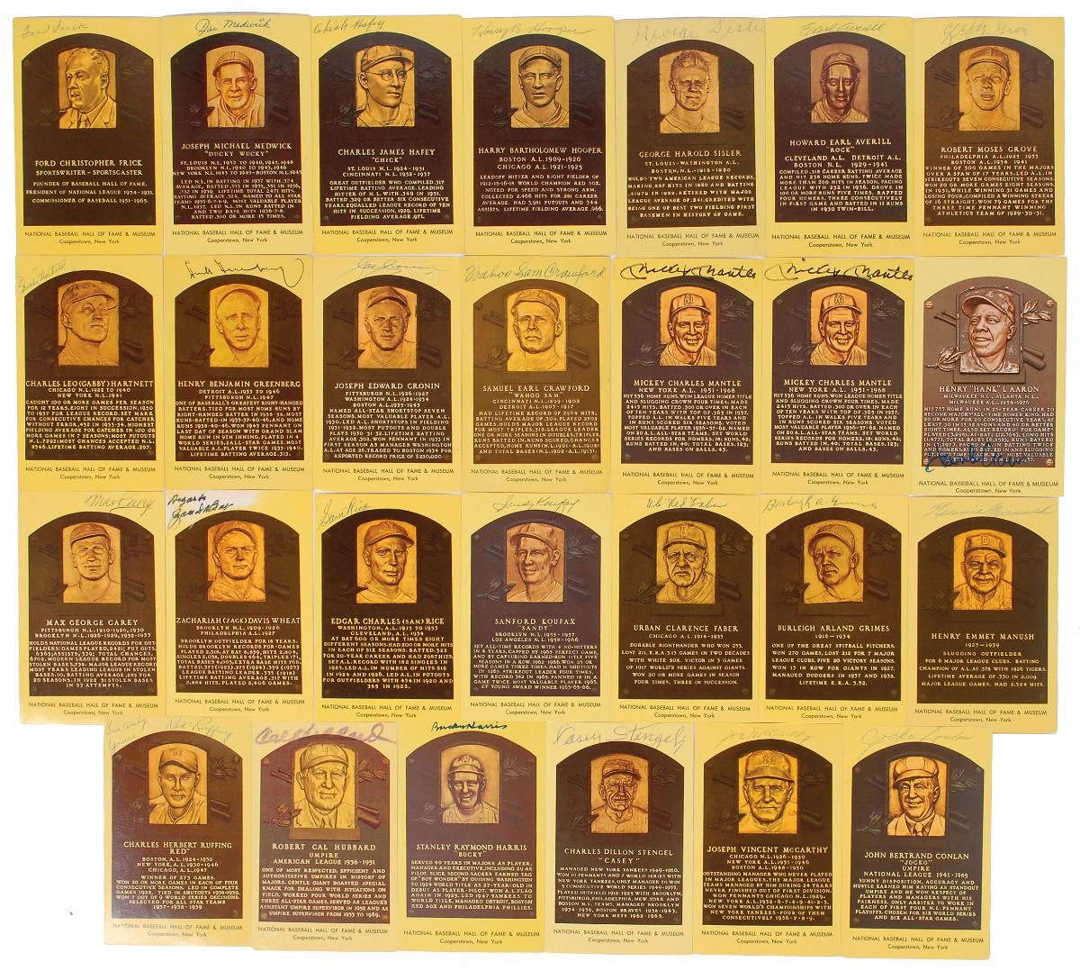 Large collection of 135 gold Hall of Fame plaque cards, each signed in felt tip or ballpoint, including: Hank Aaron, Walter Alston, Sparky Anderson, Luis Aparicio, Luke Appling (also signed on the reverse), Richie Ashburn, Earl Averill, Ernie Banks, Al Barlick, James ‘Cool Papa’ Bell, Johnny Bench, Yogi Berra, Lou Boudreau (3), George Brett, Lou Brock, Jim Bunning, Rod Carew, Max Carey, Steve Carlton, Gary Carter, Orlando Cepeda, A. B. ‘Happy’ Chandler, Jocko Conlan, Stanley Coveleski (2), ‘Wahoo’ Sam Crawford (also signed and inscribed on the reverse), Joe Cronin, Ray Dandridge, Bill Dickey, Larry Doby, Bob Doerr, Don Drysdale, Urban ‘Red’ Faber, Bob Feller (3), Rick Ferrell, Rollie Fingers, Carlton Fisk, Whitey Ford, Ford Frick, Charles Gehringer (2), Bob Gibson, Lefty Gomez, Hank Greenberg, Burleigh Grimes (2), Lefty Grove, Chick Hafey, Jesse Haines, Bucky Harris, Gabby Hartnett, Billy Herman, Harry Hooper, Waite Hoyt (2), Cal Hubbard, Carl Hubbell, Jim ‘Catfish’ Hunter, Monte Irvin (2), Reggie Jackson, Travis Jackson, Fergie Jenkins (2), Judy Johnson, Al Kaline, George R. Kelly, Harmon Killebrew, Ralph Kiner, Sandy Koufax, Tom Lasorda (signed on the reverse only), Bob Lemon (2), Buck Leonard, Freddie Lindstrom (2), Al Lopez (also signed and inscribed on the reverse), Ted Lyons, Larry MacPhail, Lee MacPhail, Mickey Mantle (2), Heinie Manush, Juan Marichal, Rube Marquard, Eddie Mathews (2), Bill Mazeroski, Joe McCarthy, Willie McCovey, Joe Medwick, Johnny Mize, Joe Morgan, Eddie Murray, Stan Musial, Hal Newhouser, Phil Niekro, Jim Palmer, Tony Perez, Gaylord Perry, Pee Wee Reese, Sam Rice, Phil Rizzuto, Robin Roberts, Brooks Robinson, Frank Robinson, Edd Roush (2), Red Ruffing, Nolan Ryan, Mike Schmidt, Red Schoendienst, Tom Seaver, Joe Sewell, George Sisler, Enos Slaughter, Ozzie Smith, Duke Snider (signed on the reverse only), Warren Spahn, Willie Stargell, Casey Stengel (also signed on the reverse), Don Sutton, Bill Terry, Lloyd Waner, Earl Weaver, Zach Wheat, Hoyt Wilhelm, Dave Winfield, Early Wynn, Carl Yastrzemski, and Robin Yount. In overall very good to fine condition. A comprehensive collection highlighted by a number of scarce names.