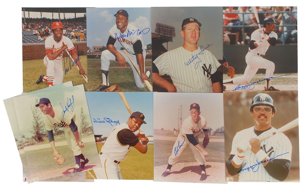 Collection of ten color glossy 8 x 10 photos of Hall of Famers, each signed by the subject in felt tip, including: Lou Brock, Sandy Koufax (2), Willie McCovey, Willie Stargell, Reggie Jackson (2), Whitey Ford, Bob Feller, and Bob Lemon. In fine condition.