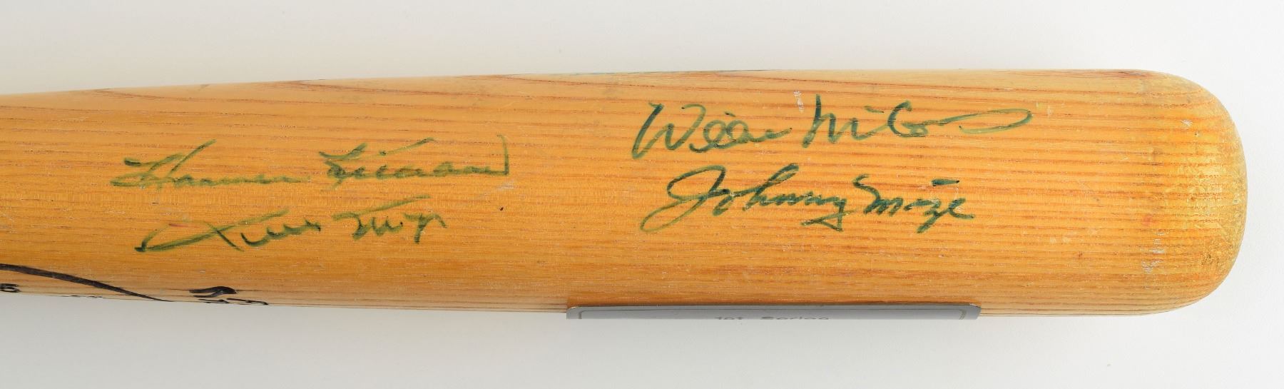 Official Louisville Slugger baseball bat signed in blue felt tip on the barrel by ten Hall of Fame hitters, including: Willie Mays, Harmon Killebrew, Willie McCovey, Johnny Mize, Brooks Robinson, Enos Slaughter, Duke Snider, Lou Brock, Billy Herman, and Lou Boudeau. An engraved plaque affixed to the barrel denotes the bat as "1st Series, Hall-of-Fame Hitters, Limited Edition of 500." In fine condition, with a few light scuffs and scratches (including one slightly affecting Slaughter's last name).