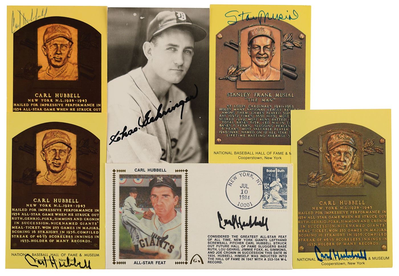 Six items signed by Hall of Famers, including: Stan Musial (gold HOF plaque card), Charlie Gehringer (postcard photo), and Carl Hubbell (three gold HOF plaque cards and a Gateway cover). In overall very good to fine condition, with a heavy diagonal crease to one of the Hubbell HOF cards.
