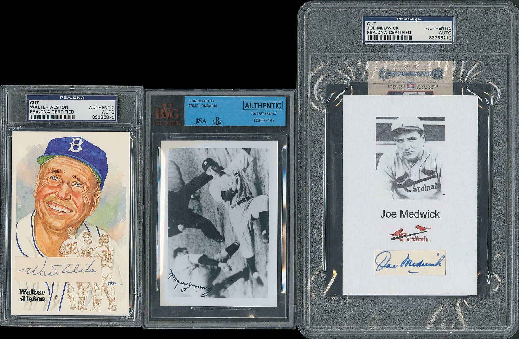 Four items signed by baseball Hall of Famers, including: Al Barlick (signed Perez-Steele card); Ernie Lombardi (signed photo, encapsulated by BVG/JSA); Walter Alston (signature affixed to a Perez-Steele card, encapsulated by PSA/DNA); and Joe Medwick (clipped signature affixed to a paperstock image, encapsulated by PSA/DNA). In overall fine condition.