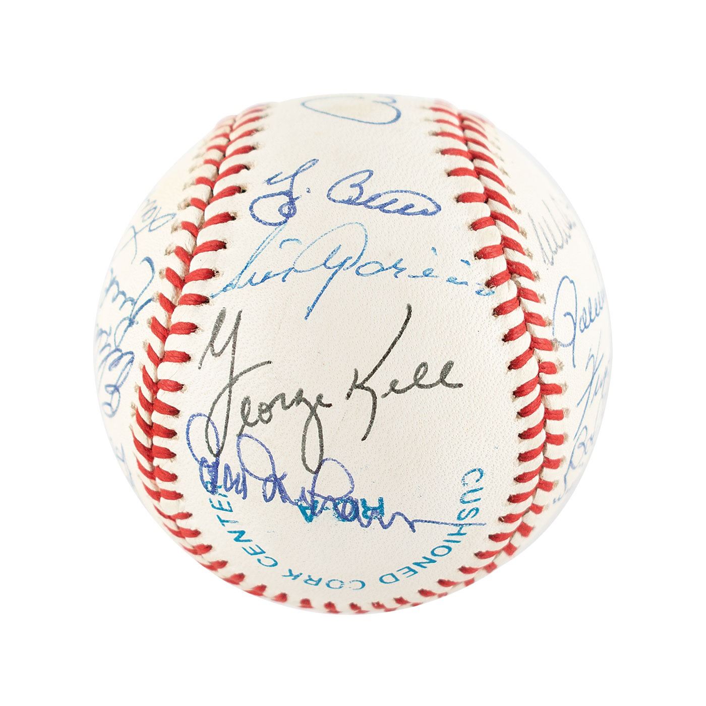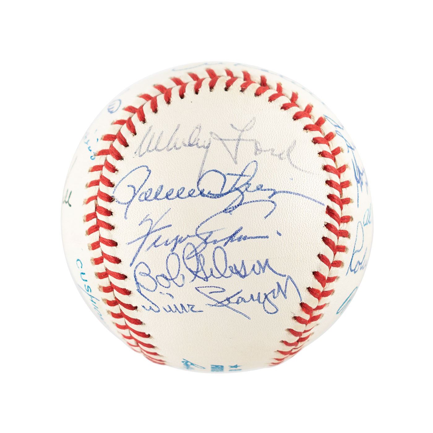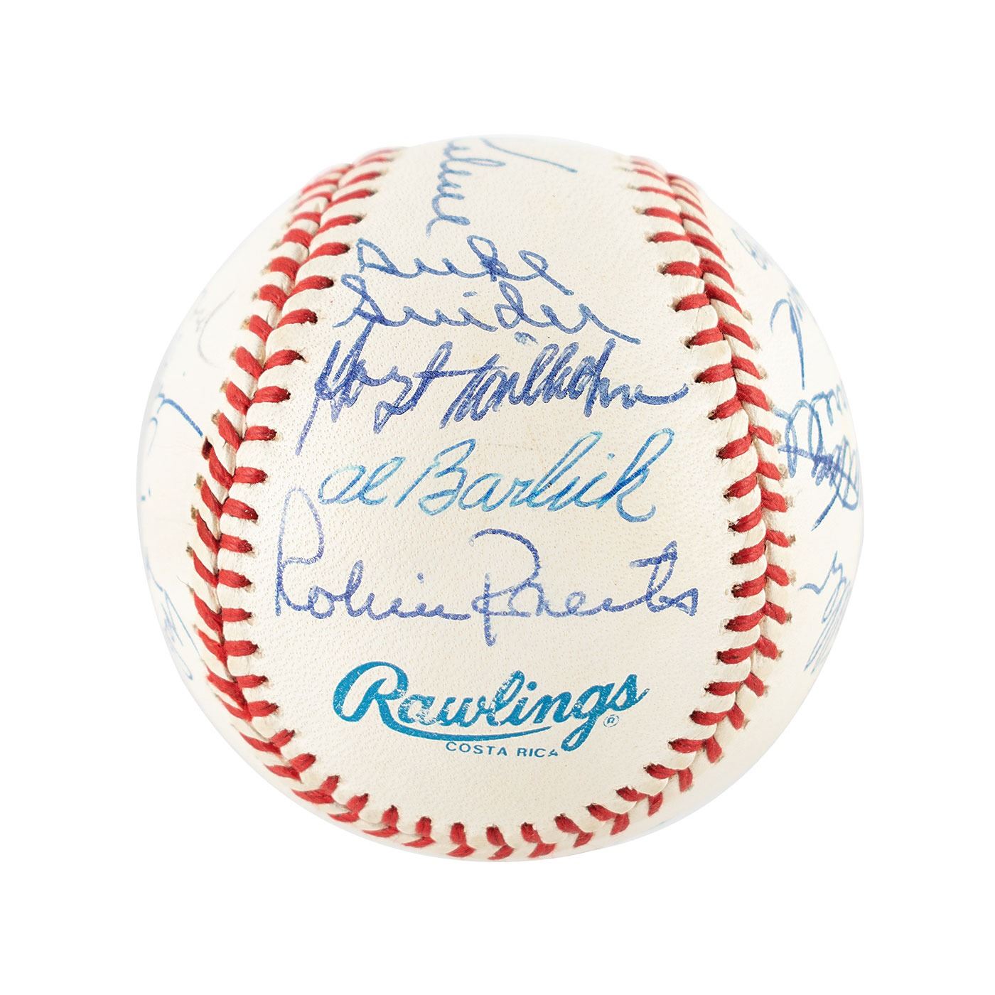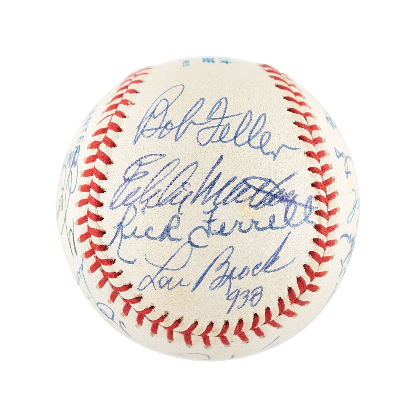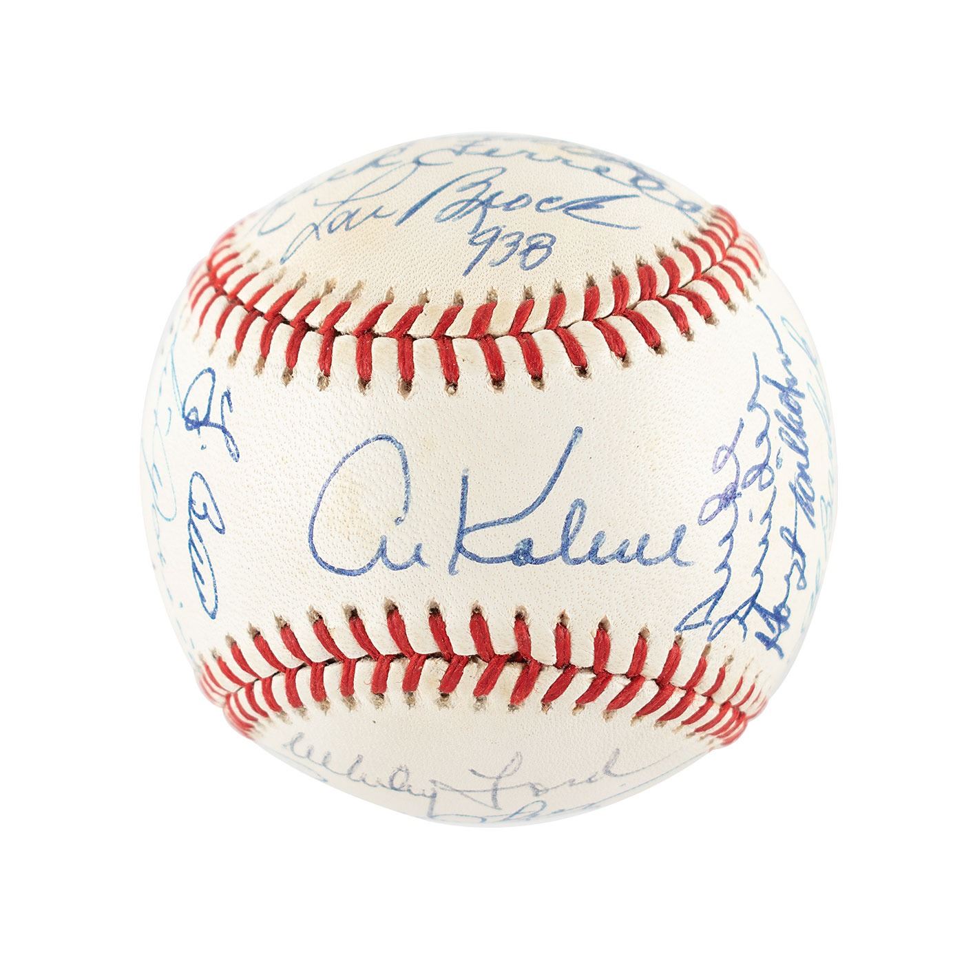 Official Rawlings American League (Brown) baseball signed in blue ballpoint on the sweet spot and side panels by 18 Hall of Famers, including: Al Kaline (ss), Yogi Berra, Robin Roberts, Eddie Mathews, Lou Brock, Willie Stargell, Whitey Ford, Al Barlick, Luis Aparicio, Bob Gibson, Hal Newhouser, Hoyt Wilhelm, Rick Ferrell, Bob Feller, George Kell, Rollie Fingers, Fergie Jenkins, and Duke Snider. In fine condition.