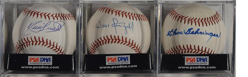 Three official Rawlings American and National League baseballs, each signed on the sweet spot in ballpoint or felt tip by a different Hall of Famer. Signers are: Chas. Gehringer (felt tip), Willie Stargell, and Kirby Puckett. All three balls are accompanied by a certificates of authenticity from PSA/DNA. In fine condition, with some light toning to Gehringer’s ball.