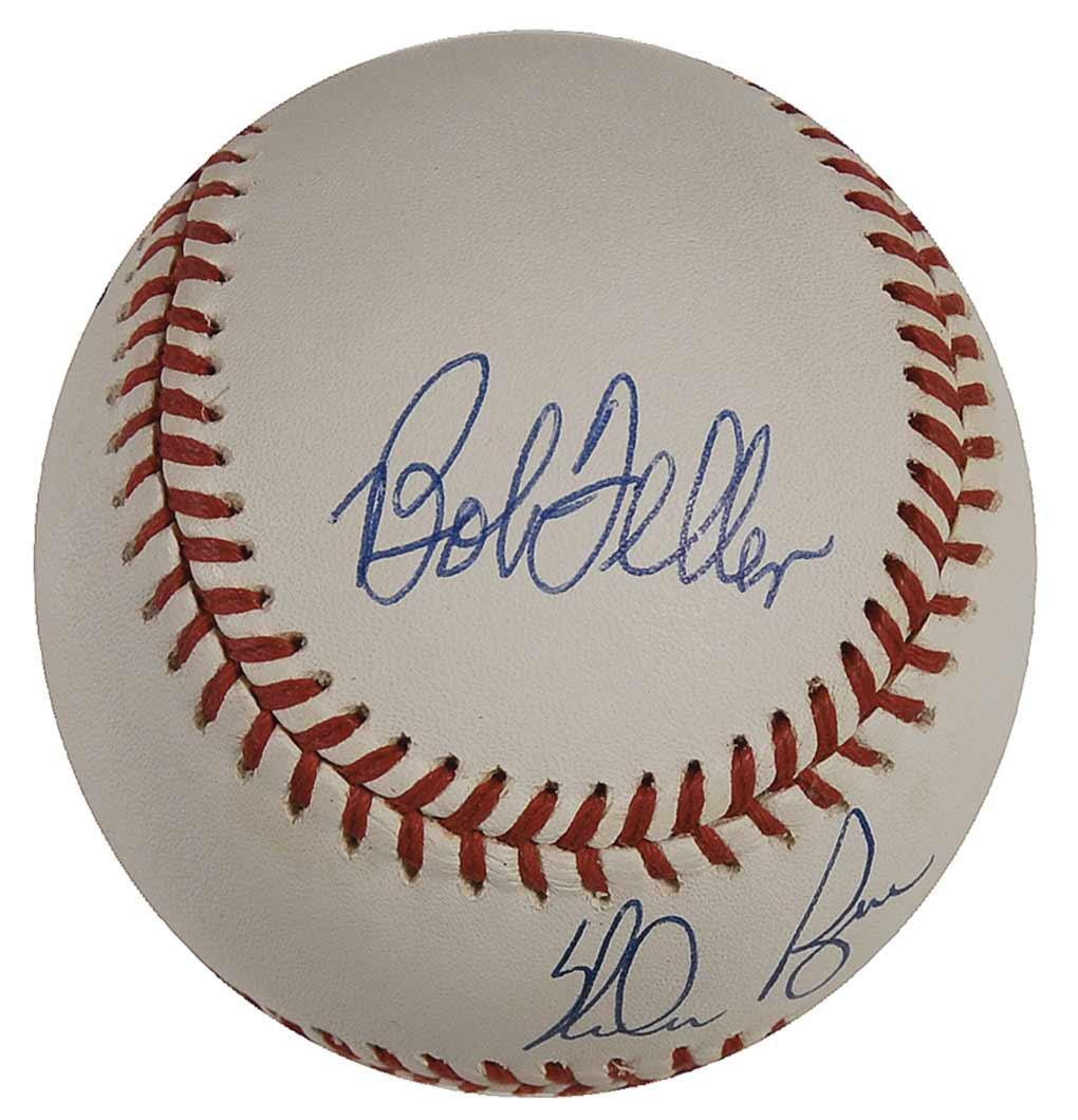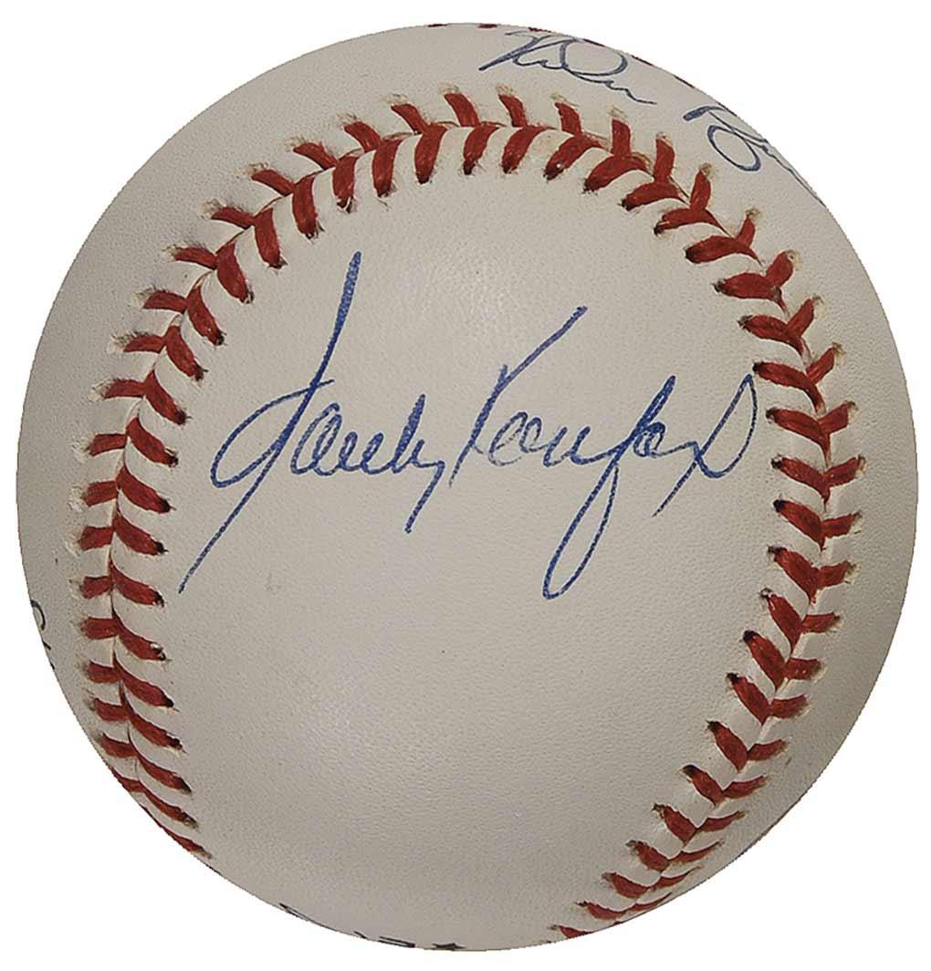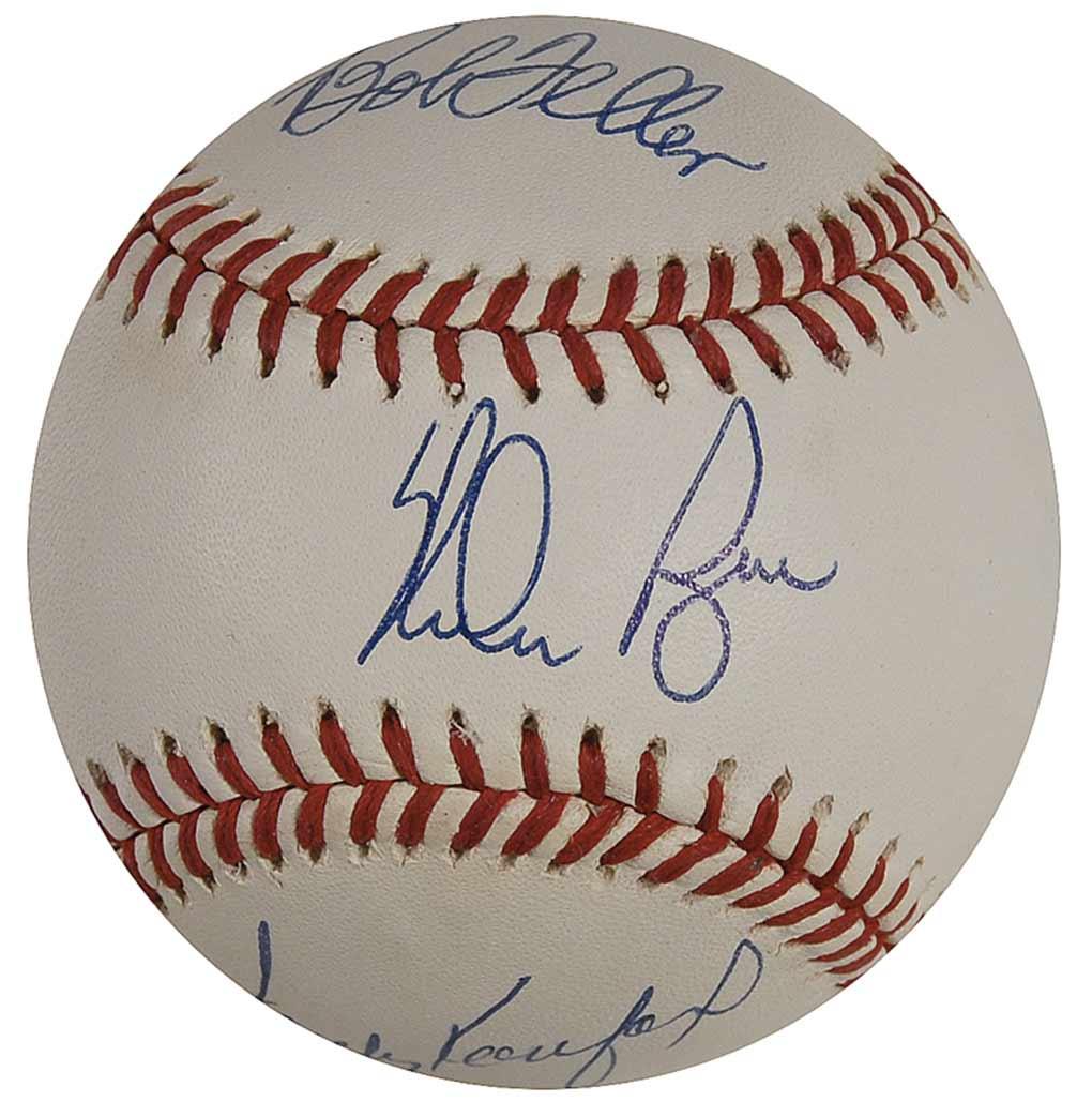 Official Rawlings National League baseball signed in blue ballpoint on the sweet spot by Nolan Ryan and on the side panels by Sandy Koufax and Bob Feller. In very fine condition.