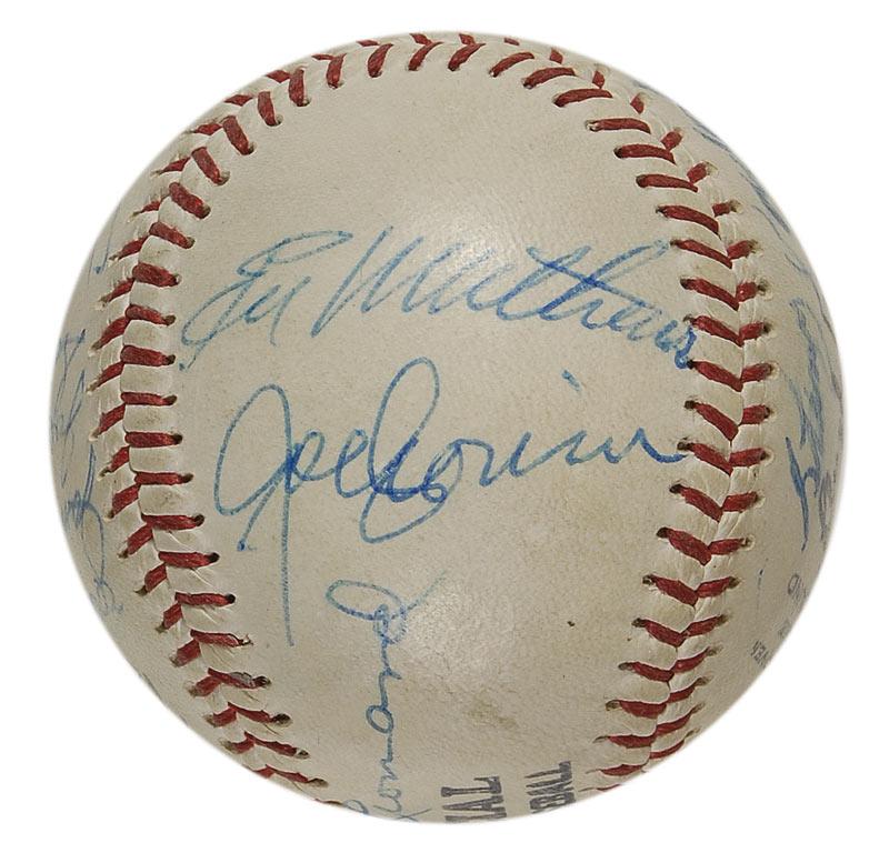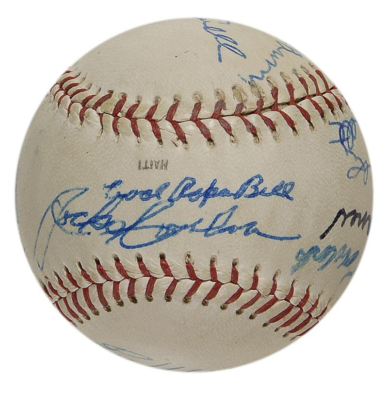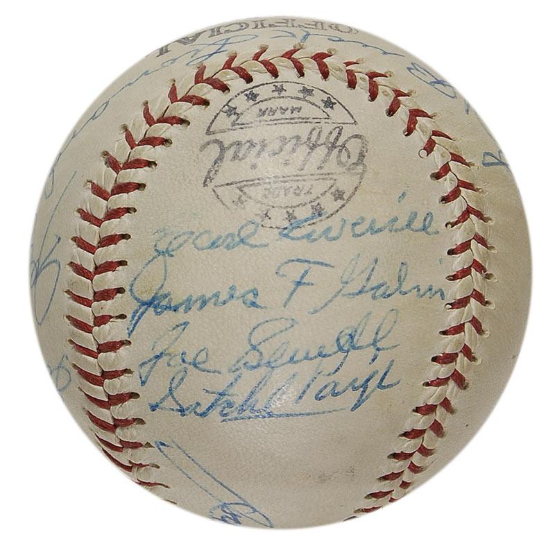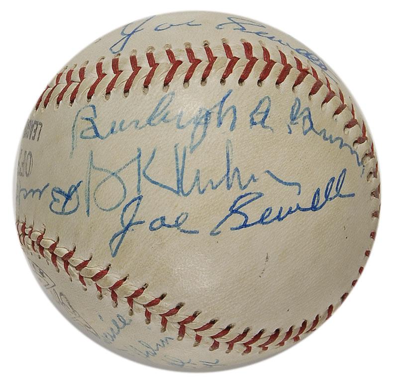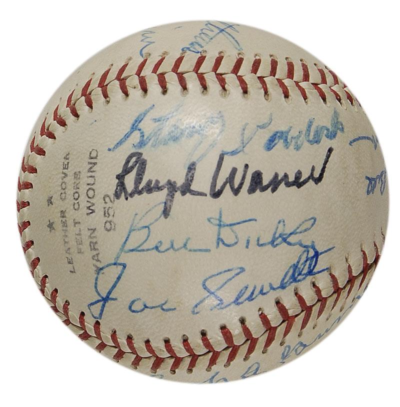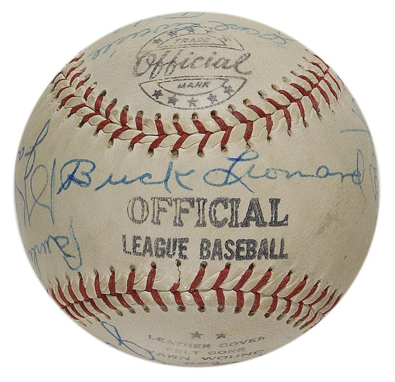 Official League baseball signed in ballpoint and felt tip by 16 Hall of Famers. Signers are: ‘Cool Papa’ Bell and Jocko Conlon on the sweet spot, Stan Koveleski, Lloyd Waner, Bill Dickey, Joe Sewel, Earl Averill, Joe Sewell (2), Satchel Paige, James Galin, Burleigh Grimes, Bowie Kuhn, Ed Mathews, and Joe Cronin. In fine condition, with some scattered light toning and soiling. Pre-certified Steve Grad/PSA/DNA and RRAuction COA.