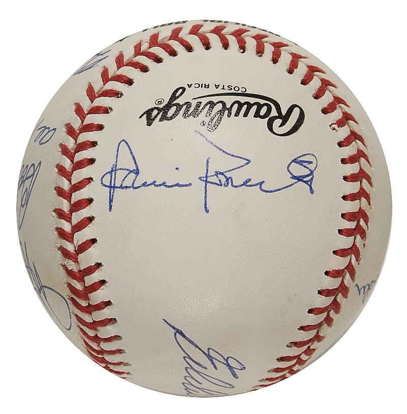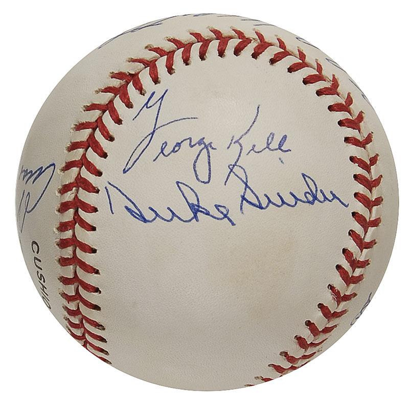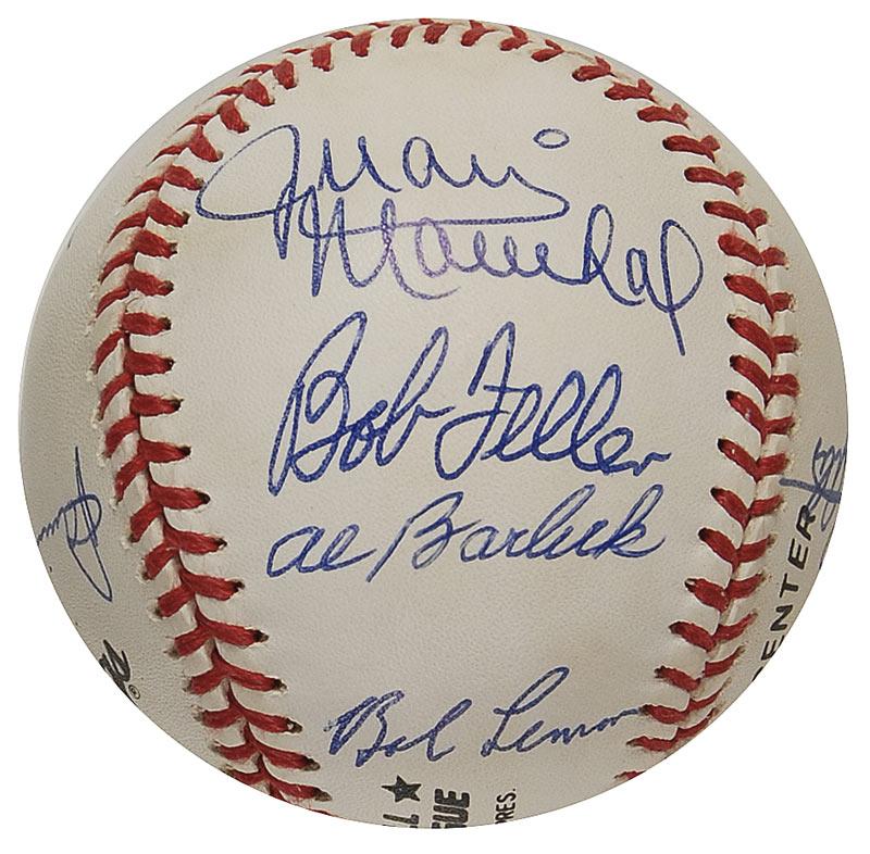 Official Rawlings National League baseball signed in blue ballpoint by nine Hall of Famers: Eddie Mathews (ss), Enos Slaughter, Robin Roberts, George Kell, Duke Snider, Bob Lemon, Al Barlick, Bob Feller, and Juan Marichal. In fine condition, with some scattered mild toning. Pre-certified Steve Grad/PSA/DNA and RRAuction COA.