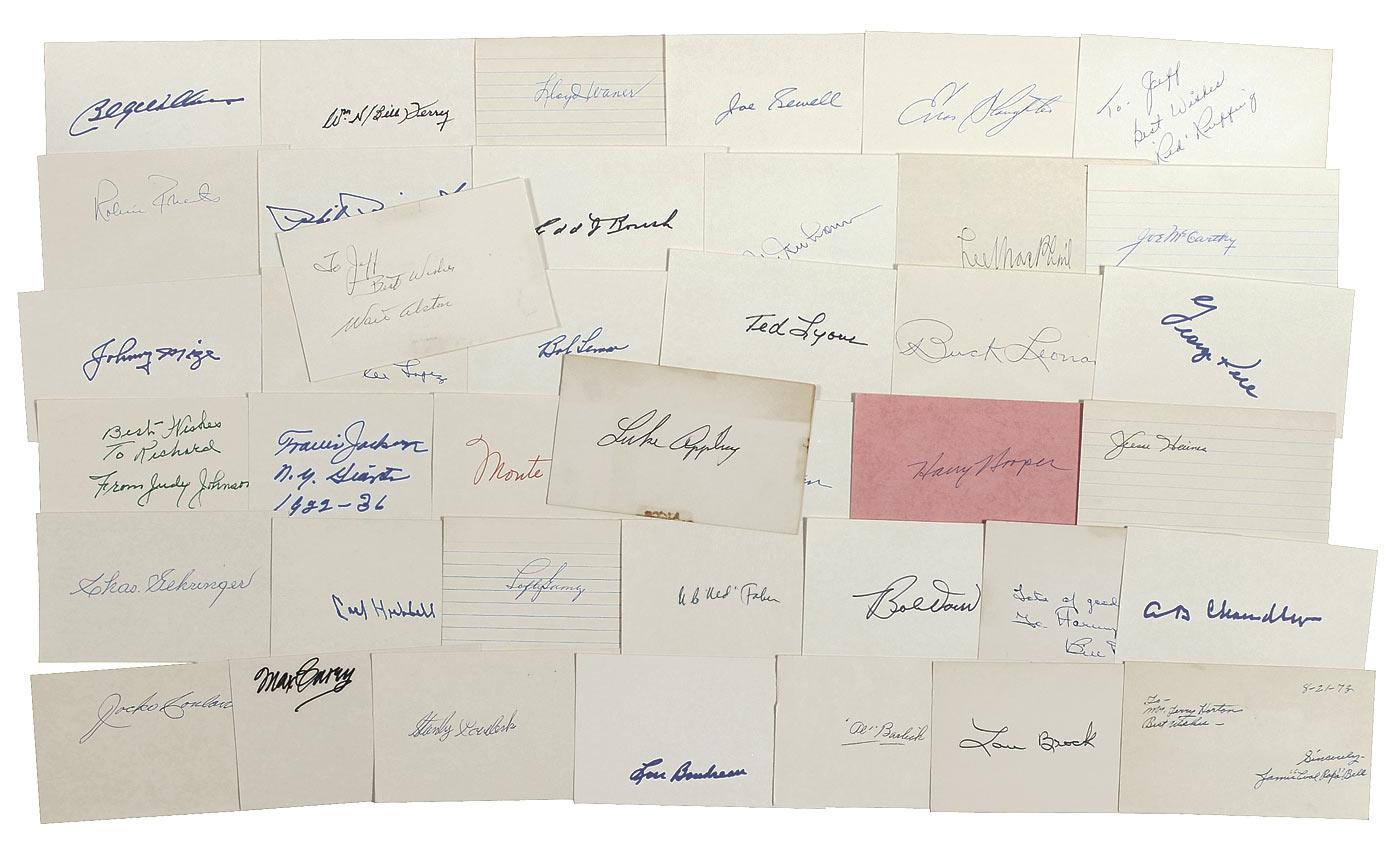 Ink and felt tip signatures of 41 Hall of Famers on 5 x 3 cards (some lined). Signers are: Hank Aaron, Walt Alston, Luke Appling, James ‘Cool Papa’ Bell, Al Barlick, Lou Brock, Lou Boudreau, Max Carey, Stan Coveleski, Jocko Conlon, A. B. Chandler, Bill Dickey, Bob Doerr, Red Faber, Lefty Gomez, Charles Gehringer, Carl Hubbell, Jesse Haines, Harry Hooper, Billy Herman, Monte Irvin, Travis Jackson, Judy Johnson, George Kell, Buck Leonard, Ted Lyons, Bob Lemon, Al Lopez, Johnny Mize, Joe McCarthy, Lee McPhail, Hal Newhouser, Edd Roush, Phil Rizzuto, Robin Roberts, Red Ruffing, Enos Slaughter, Joe Sewell, Bill Terry, Lloyd Waner, and Billy Williams. In very good overall condition. RRAuction COA.