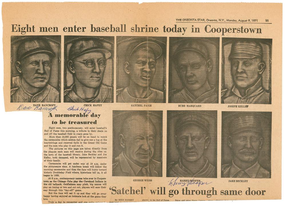 Clipped newspaper page from the August 9, 1971, issue of The Oneonta Star, featuring images of the eight Hall of Fame plaques for that year’s inductees, signed in blue ballpoint under their respective plaques by Dave Bancroft, Chick Hafey, and Harry Hooper. Expected folds, irregular bottom edge, and uniform toning, otherwise fine condition. Pre-certified Steve Grad/PSA/DNA and RRAuction COA.