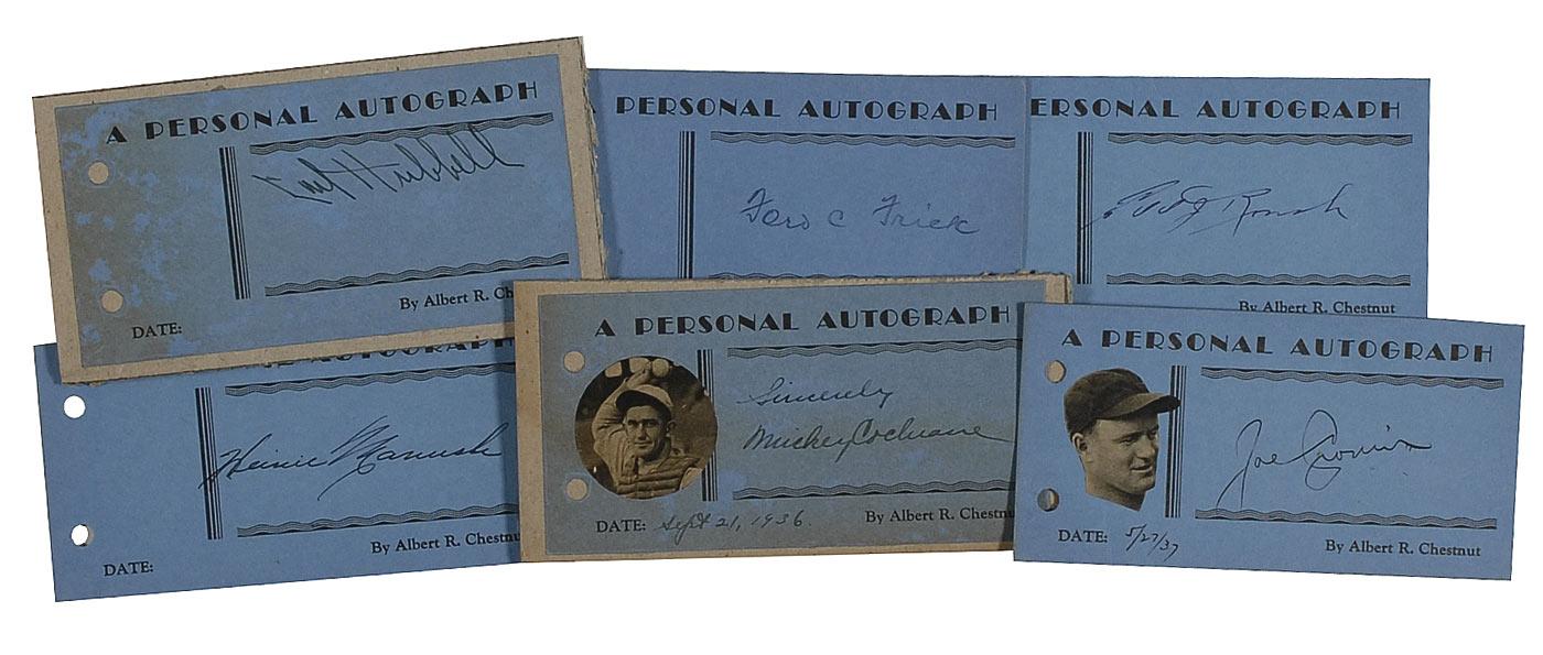 Vintage fountain pen signatures of Carl Hubbell, Heinie Manush, Mickey Cochrane, Edd Roush, Ford Frick, and Joe Cronin on individual 5.5 x 2.75 blue cards from the Albert R. Chestnut collection, some affixed to a slightly larger cards and bearing small clipped photos affixed to the blank left area. In very good condition, with scattered mild toning and punch holes to left edge. RRAuction COA.