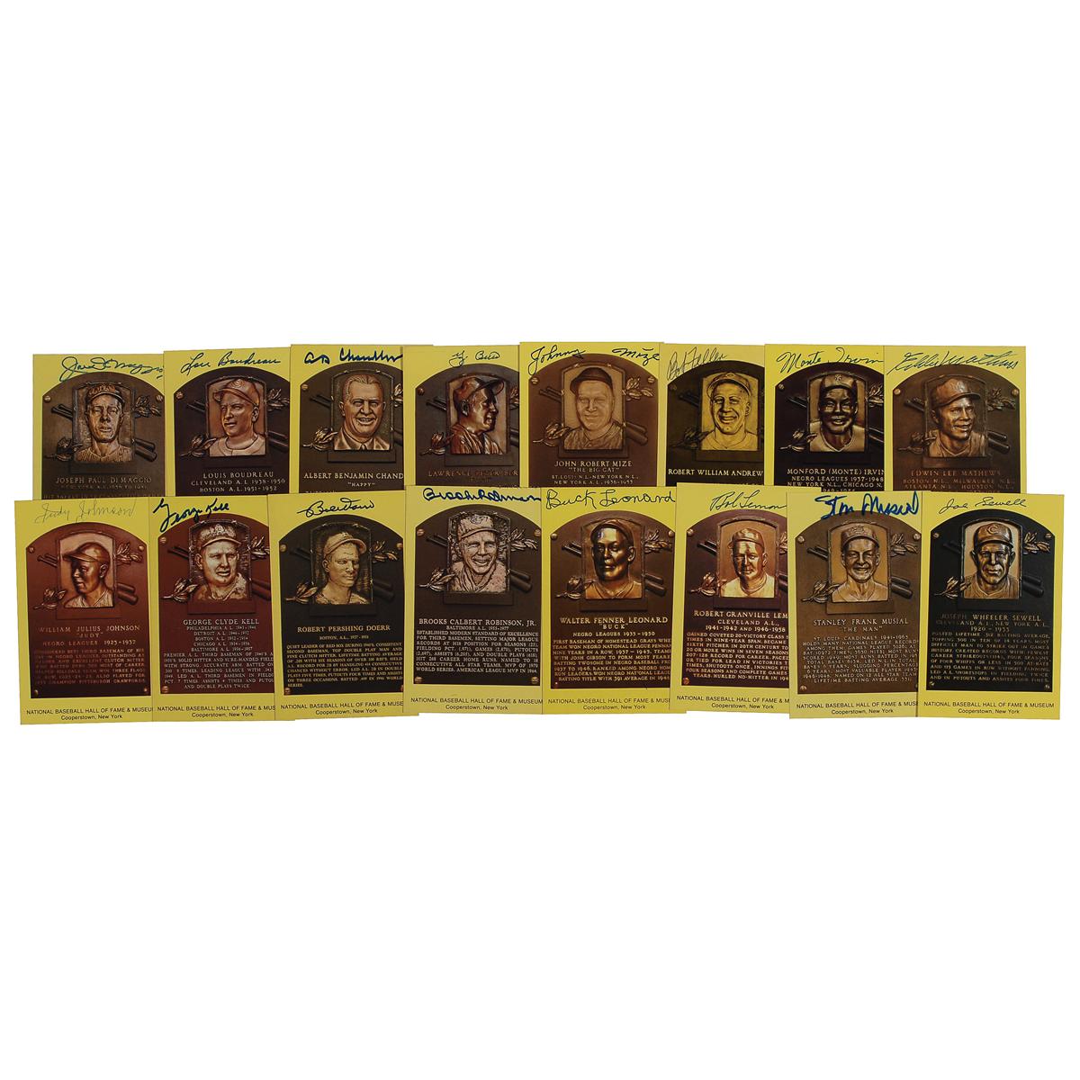 Sixteen gold Hall of Fame plaque cards, each signed in ink or felt tip by the respective Hall of Famer pictured. Signers are: Joe DiMaggio, A. B. Chandler, Lou Boudreau, Yogi Berra, Bob Feller, Monte Irvin, Eddie Mathews, Judy Johnson, George Kell, Bob Doerr, Brooks Robinson, Buck Leonard, Bob Lemon, Stan Musial, and Joe Sewell. In fine overall condition, with some light irregular ink adhesion to a few signatures.