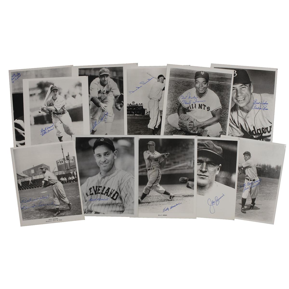 Eleven glossy 8 x 10 portraits or action shots of baseball Hall of Famers, each signed in blue felt tip. Signers are: Luke Appling, Earl Averill, Al Barlick (adding “With Best Wishes”), Joe Cronin, Billy Herman, Monte Irvin (adding “Best Wishes”), Buck Leonard (pre-stroke, adding “Best wishes”), Pee Wee Reese (adding “Best Wishes”), Joe Sewell (adding “With Best Wishes”), Duke Snider, and Lloyd Waner (adding “’Little Poison’”). In overall fine condition, a few with scattered surface marks.