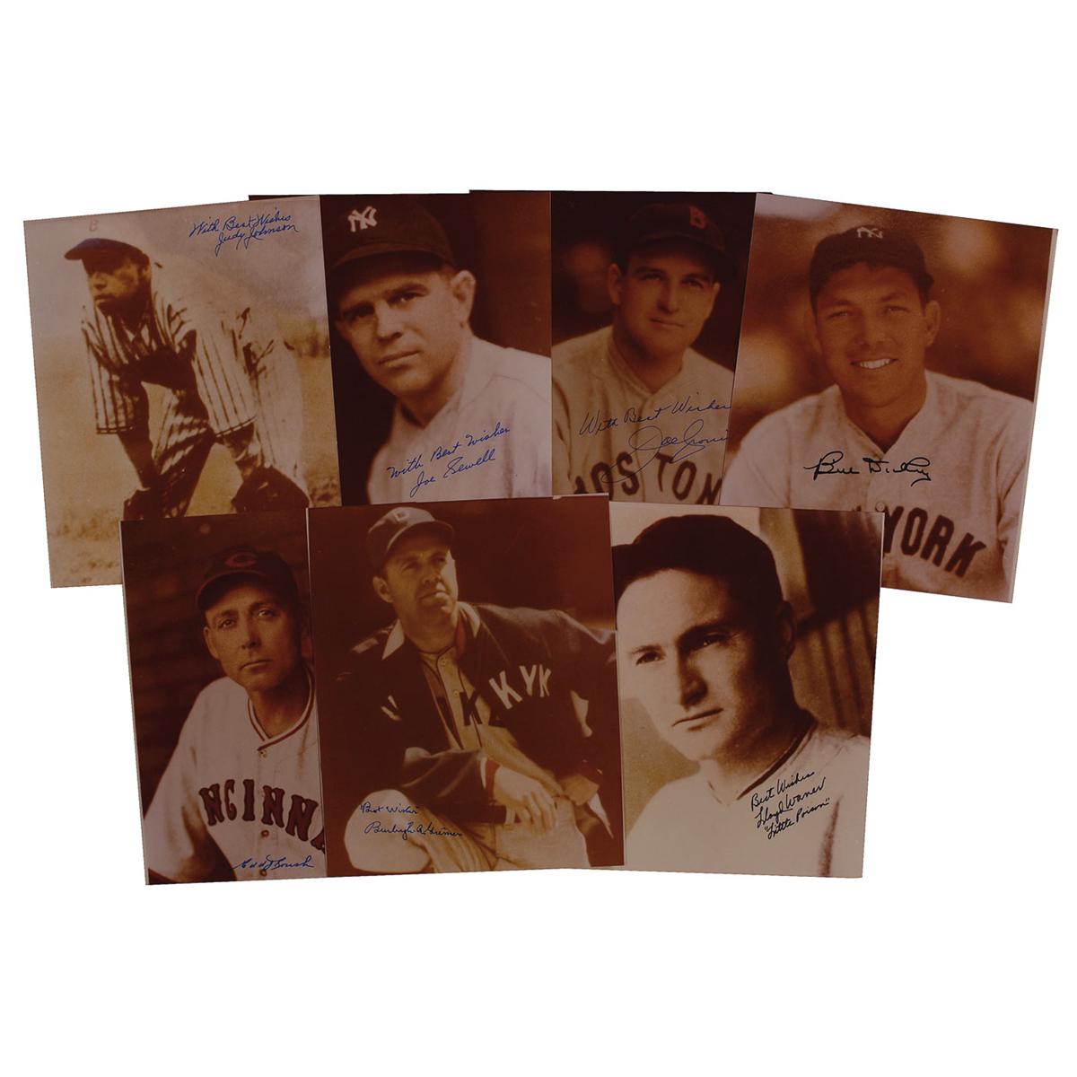 Seven satin-finish 8 x 10 photos of a Hall of Famer, each signed in blue or black felt tip by its respective subject. Signers are: Joe Cronin, Bill Dickey, Burleigh A. Grimes, Judy Johnson, Edd J. Roush, Joe Sewell, and Lloyd Waner. Five players have added a sentiment or nickname. Mild to moderate image graininess to each, otherwise overall fine condition. Uncommon in a color format.