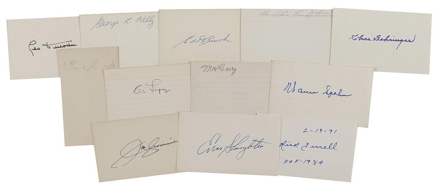 Ink and felt tip signatures of 12 members of the Hall of Fame on individual off-white 5 x 3 cards (some lined). Signers are: Leo Durocher, George Kelly, Edd Roush, Freddie Lindstrom, Chas. Gehringer, Ernie Lombardi, Al Lopez, Max Carey, Warren Spahn, Enos Slaughter, Rick Ferrell, and Joe Cronin. In fine overall condition.