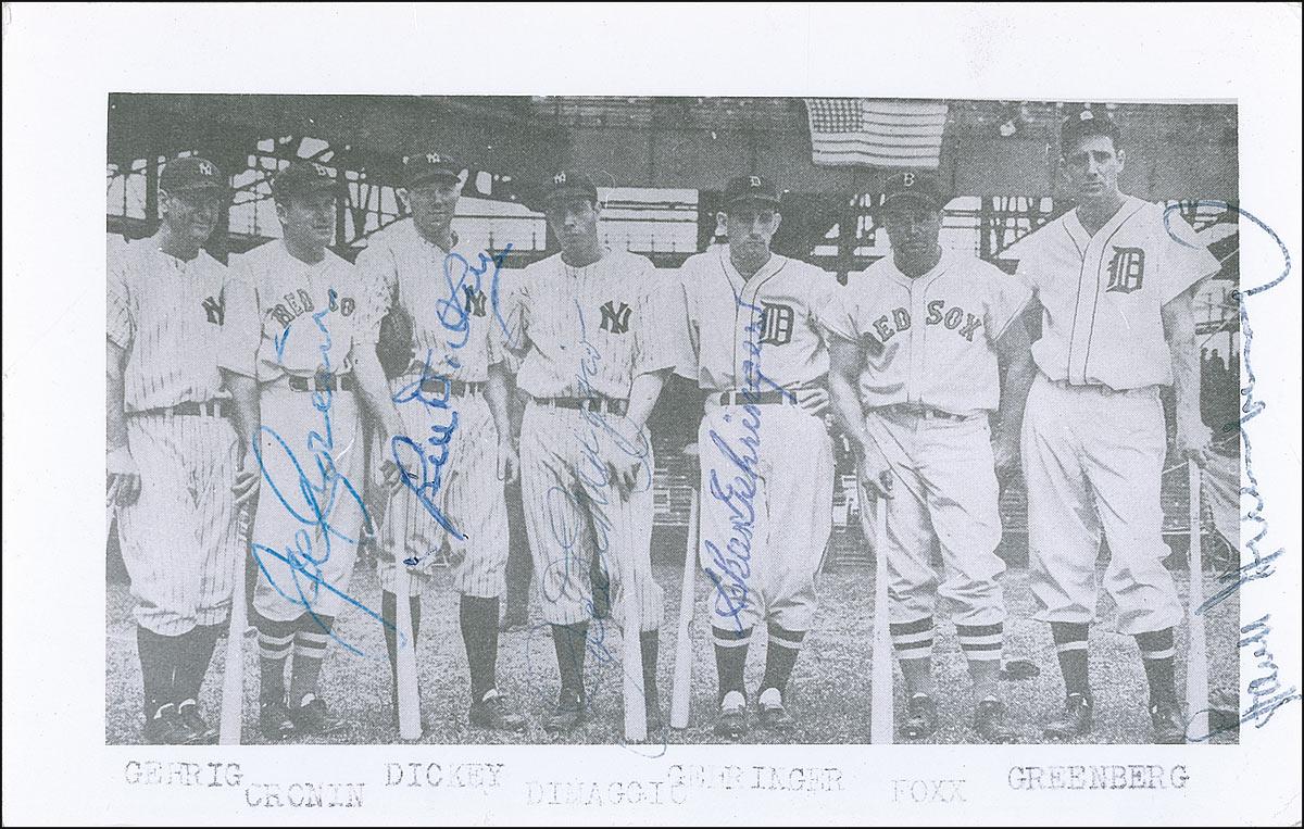 Neat 5.5 x 3.5 postcard photo of the 1937 American League All Star line-up, signed in blue ballpoint by Joe Cronin, Bill Dickey, Chas. Gehringer, and Hank Greenberg. Photo also bears a secretarial Joe DiMaggio signature. Light skipping to Greenberg’s signature and some light corner tip creases, otherwise fine condition.