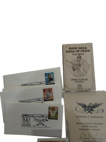 This is a phenomenal, curated collection for the baseball enthusiast, featuring a diverse array of memorabilia from Hall of Famers, MVPs, and iconic moments in baseball history. This box combines autographed items with Certificates of Authenticity (COA), limited edition prints, commemorative stamps, autographs and classic trading cards.