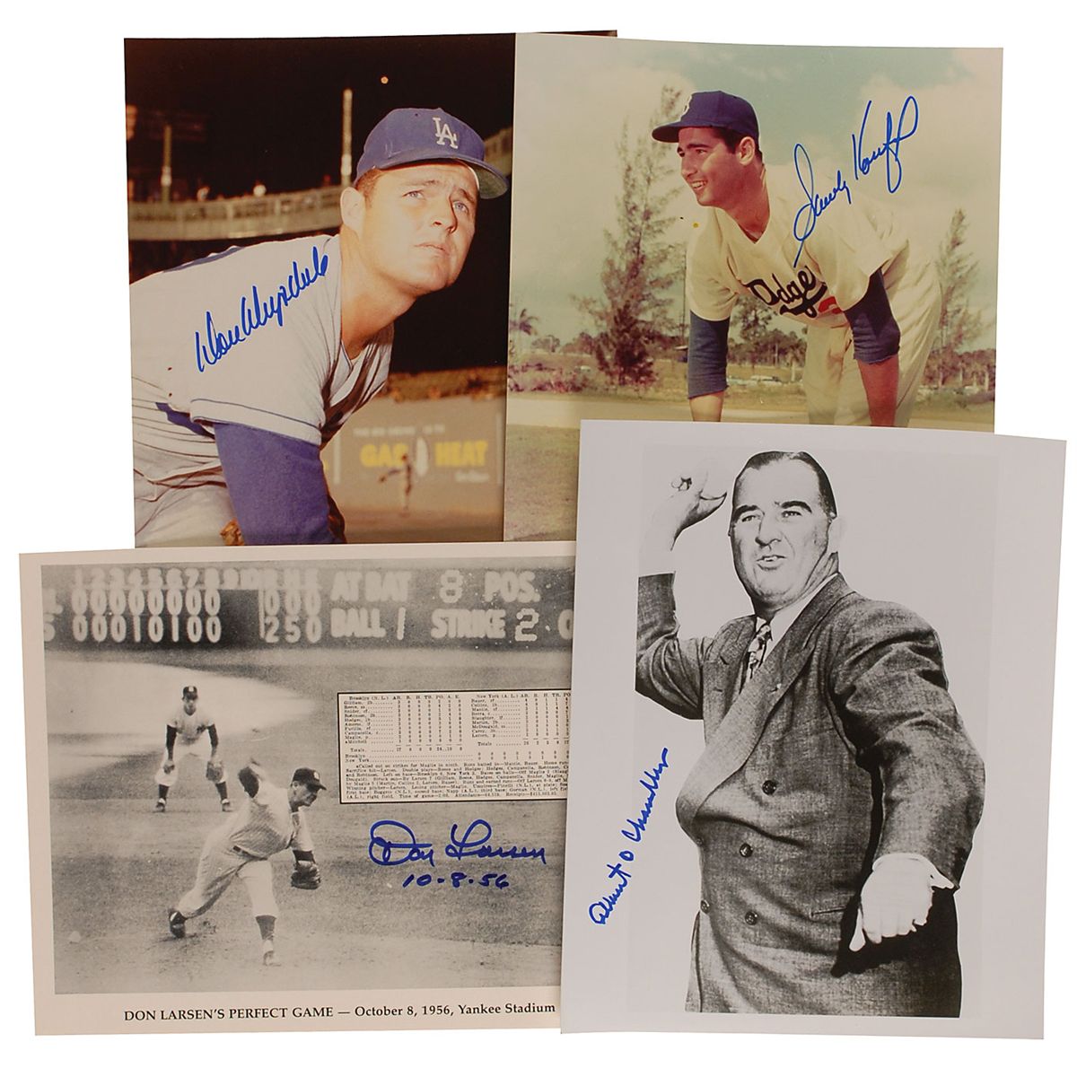 Four photos of various finishes, two color, 8 x 10 and 10 x 8, each signed in blue felt tip by the baseball legend pictured. Signers are: Sandy Koufax, Don Drysdale, A. B. ‘Happy’ Chandler, and Don Larsen. In overall fine condition.