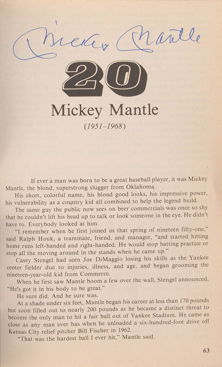 Signed book: Baseball’s 100. Later printing. NY: Galahad Books, 1982. Hardcover with dust jacket, 6.25 x 9.5, 316 pages. Signed inside by 48 baseball players, with a few inscribed, and many adding their jersey numbers, including: Willie Mays, Hank Aaron, Ted Williams, Stan Musial, Joe DiMaggio, Mickey mantle, Rod Carew, Reggie Jackson, Sandy Koufax, Yogi Berra, Gaylord Perry, Ernie Banks, Willie Stargell, Harmon Killebrew, Whitey Ford, and more. In very good to fine condition, with occasional light soiling and toning.
