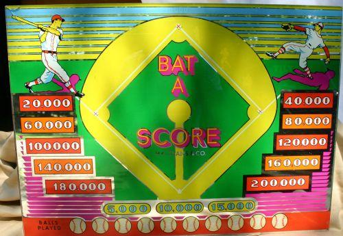 Bat-a-Score back glass with baseball motif for arcade game. Two small cracks top left corner approximately 1" and 1 ½" . Good graphics.
