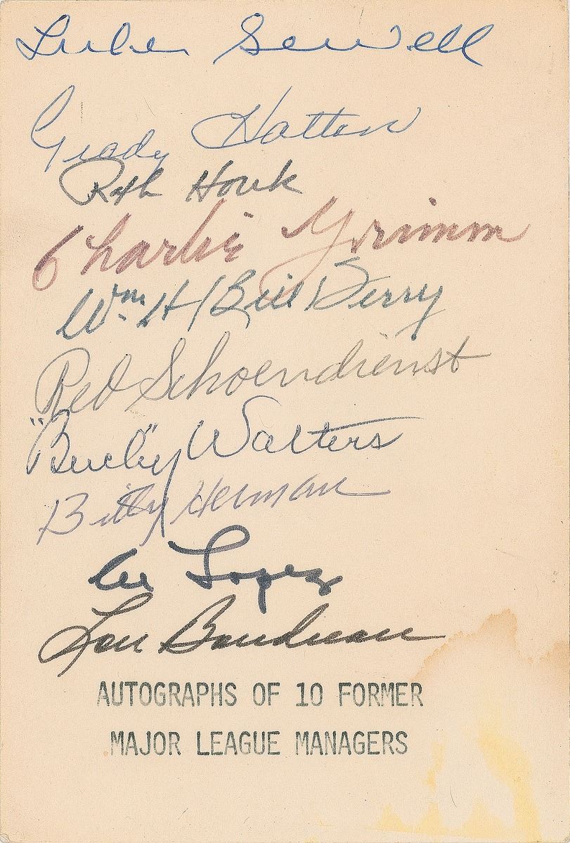 Ink signatures of ten MLB managers on an off-white 4 x 6 card, including: Bucky Walters, Billy Herman, Al Lopez, Lou Boudreau, Red Schoendienst, Bill Terry, Charlie Grimm, Ralph Houk, Grady Hatton, and Luke Sewell. In fine condition, with light creasing and a stain to the lower right corner.
