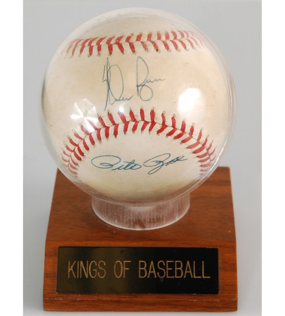 Kings of Baseball mounted and encased baseball signed by Nolan Ryan, Pete Rose and Hank Aaron. Numbered 1652 of a series with certificate of authenticity and unconditionally guaranteed by Americana Memorabilia, Inc. Sealed with the Official Seal of the Americana Memorabilia, Inc. Mt Laurel New Jersey. Mounted on wooden base. 4.5" x 3".